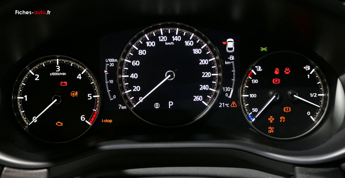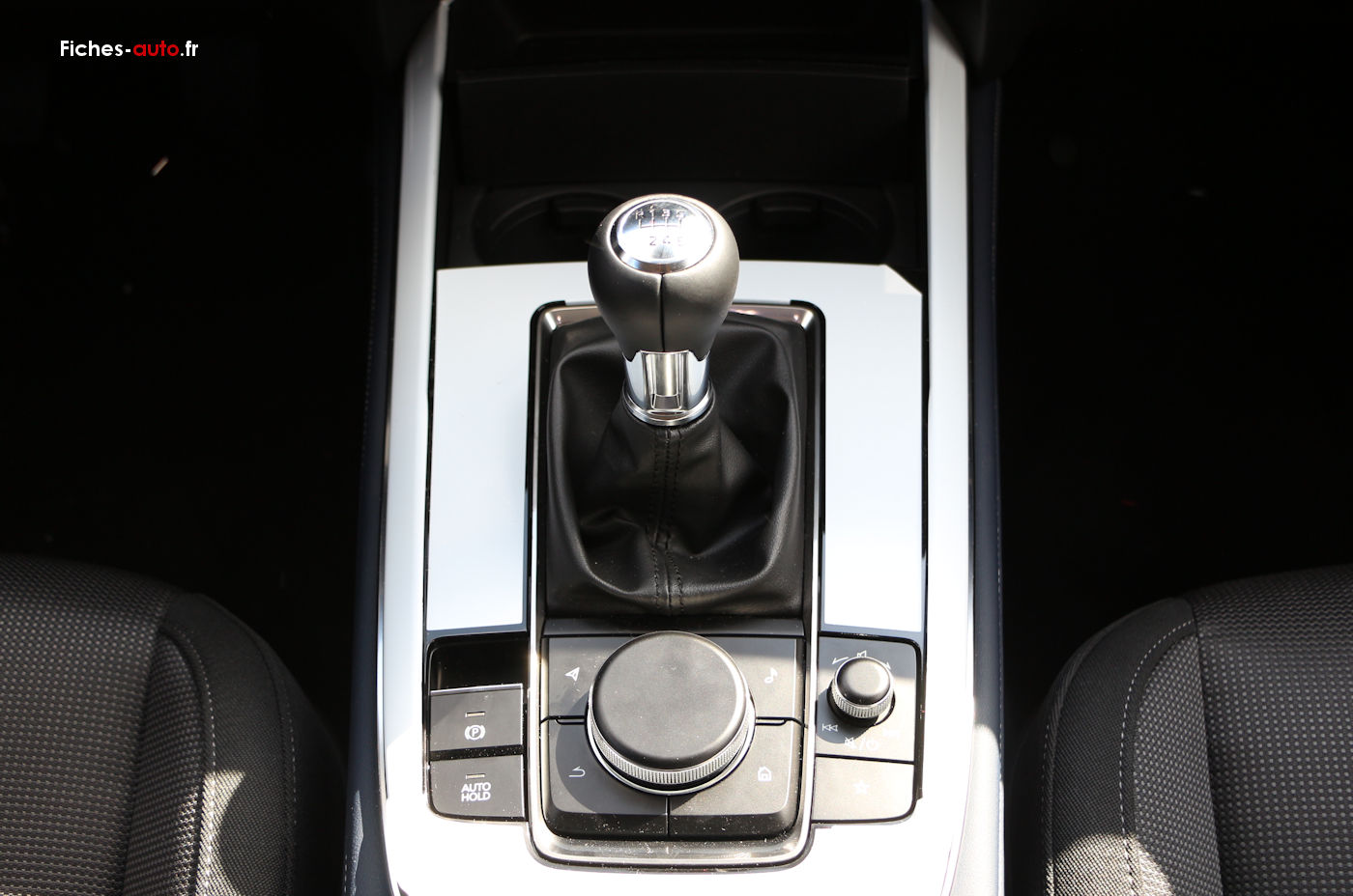 (Source Mazda Décembre 2021) A partir de 26 900 euros : Jantes alliage 16” « Gray » // Phares avant à LED avec fonction antibrouillard intégrée // Clignotants « Kodo Turn » // Feux arrière à LED // Becquet de toit // Moulures de vitres latérales chromées // Sellerie tissu noir // Inserts décoratifs noirs sur planche de bord et liserés d’aérateurs « Silver » // Siège conducteur réglable manuellement 8 voies // Siège passager réglable manuellement 6 voies // Essuie-glaces avec buse de lave-glace intégrée // Vitres électriques avant et arrière avec commande à impulsion pour chaque vitre // Rétroviseurs extérieurs chauffants, réglables électriquement et à rabattage automatique // Volant et pommeau de vitesses gainés de cuir // Sièges arrière rabattables 60/40 // Éclairage d’ambiance intérieur à LED // Climatisation manuelle // Aide au stationnement arrière // Affichage tête haute projeté (ADD) // Phares et essuie-glaces automatiques // Assistance au démarrage en côte (HLA) // Système « G-Vectoring Control Plus » (GVC+) // Kit de réparation anti-crevaison // Système de surveillance de pression des pneus (TPMS) // Aide au freinage intelligent en mode urbain (SCBS avancé) avec reconnaissance des piétons // Système de surveillance des angles morts (BSM) // Reconnaissance active d’obstacles mobiles en marche arrière (RCTA) // Système d’alerte du conducteur (DAA) // Système de maintien de trajectoire (LAS) // Régulateur de vitesse adaptatif Mazda (MRCC) (0-200 km/h) et aide au freinage intelligent (SBS) // Limiteur de vitesse avec adaptation intelligente de la vitesse (ISA) couplé à la reconnaissance des panneaux de signalisation (TSR) // Gestion automatique des feux de route (HBCS) // Compteur numérique 7” avec ordinateur de bord couleur // Système audio avec radio AM/FM/DAB et 8 haut-parleurs // Système Mazda Connect avec écran couleur 8,8” TFT et système de navigation // Système Bluetooth® avec commandes au volant // Apple CarPlay™/Android Auto™ // Prises USB et 12V