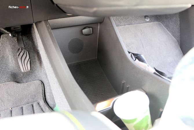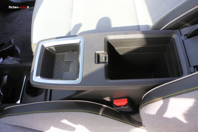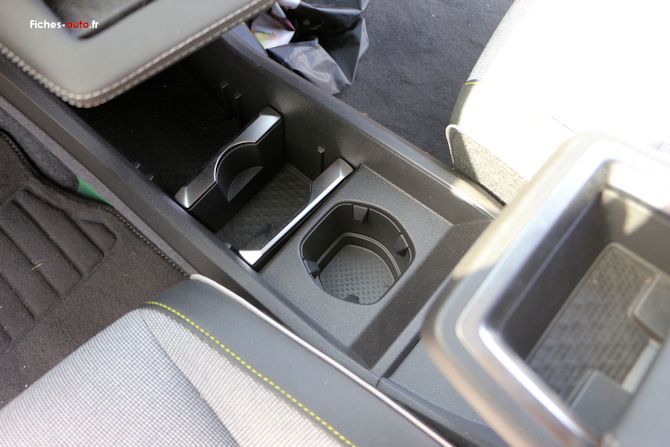 Tout d'abord, il n'y a rien à portée de main qui permettent de poser des choses pour les reprendre facilement (sauf version de base sans couvercle d'accoudoir). Vous avez au choix l'accoudoir (peu accessible car reculé et couvert d'un couvercle) ou le rangement sous console centrale qui est à la fois trop loin (il faut se baisser et tendre le bras, pas génial en roulant) et peu pratique car la zone la plus proche est incarnée par un porte gobelet (peu apte à bien accueillir les choses). Et d'ailleurs, ce porte gobet aurait pu être doublé pour pouvoir mettre deux boissons, surtout que son socle a un format un peu bâtard qui ne va pas avec tous les types de canette et bouteilles. Tout ce qui est derrière ce porte gobelet est définitivement inaccessible en conduisant.