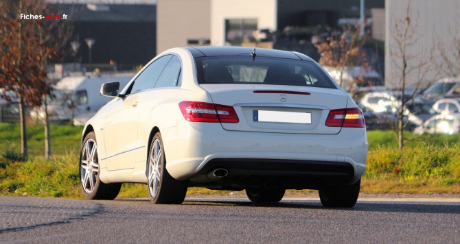 Source catalogue Mercedes. SECURITE : ABS et freinage d'urgence assisté , aide au démarrage en côte, AGILITY CONTROL : train de roulement avec système d'amortissement sélectif , Airbag genoux pour conducteur , Airbags bassin , Airbags de tête pour conducteur et passager avant (Classe E Cabriolet uniquement) , Airbags frontaux à deux seuils de déclenchement , Airbags latéraux avant , Airbags rideaux (Classe E Coupé uniquement) , Allumage automatique des projecteurs , Antivol à clé électronique avec système de verrouillage ELCODE , Appuie-tête actifs NECK-PRO à l'avant , ATTENTION ASSIST : système de détection de somnolence , Avertisseur de perte de pression de pneus (témoin uniquement) , Capot moteur actif pour la protection des piétons , Ceintures de sécurité 3 points avec rétracteurs à l'avant et limiteurs d'effort (x4) , COLLISION PREVENTION ASSIST : système d'avertissement des risques de collision , Détecteur d'occupation du siège passager avant , ESP (régulation de comportement dynamique) et ASR (antipatinage) , Feux arrière antibrouilllard , Feux de jour à LED , Feux de stop adaptatifs , Filtres à particules (motorisations diesel uniquement) , ISOFIX : fixations pour sièges-enfants à l'arrière , PRE-SAFE® : système de sécurité préventive , Projecteurs et feux arrière antibrouillard , Projecteurs semi LED, Roue de secours de type galette (sauf E 350 BlueTEC) , TEMPOMAT (régulateur de vitesse) et SPEEDTRONIC (limiteur de vitesse). CONFORT : Accoudoir central avant avec vide poches (non climatisé) , Avertisseur dynamique de maintenance (ASSYST PLUS) , Banquette arrière rabattable 2/3 - 1/3 (uniquement sur Classe E Coupé) , Boîte de vitesses automatique à 7 rapports 7G-TRONIC PLUS avec fonction d'arrêt/redémarrage "Stop/Start ECO" (commutateur de désactivation manuelle) et levier sélecteur DIRECT SELECT avec palettes de commande au volant (E 250, 6 cylindres et 8 cylindres) , Boîte de vitesses mécanique à 6 rapports optimisés avec fonction d'arrêt/redémarrage "Stop/Start ECO" (commutateur de désactivation manuelle) (4 cylindres diesel et E 200) , Clignotants à commande confort par impulsions , Climatisation automatique THERMATIC à deux zones , Colonne de direction réglable manuellement en hauteur et en profondeur , Combiné d'instruments à fond noir avec écran couleur 10,9 cm (4,3'') , Détecteur de pluie , Direction paramétrique assistée et asservie à la vitesse , Lève-vitres électriques (x4) à commande séquentielle et dispositif anti-pincement , Levier de vitesses en cuir Nappa (BM6 uniquement) , Ordinateur de bord , Prises 12 V à l'avant , Radio Audio 20 avec écran couleur 14,7 cm (5,8''), lecteur CD compatible MP3, port USB, clavier numérique intégré, connexion Bluetooth pour téléphone portable , Sièges avant avec fonction Easy Entry , Sièges avant partiellement électriques (hauteur du coussin d'assise et inclinaison du dossier) , Volant multifonctions en cuir Nappa à 3 branches avec insert chromé, cuir perforé au niveau des zones de préhension Design , Éclairage des seuils de portes , Feux arrières à technologie LED , Garnitures intérieures en tissu /similicuir ARTICO , Horloge analogique au niveau de la console centrale , Inserts décoratifs en aluminium clair sur la console centrale, le tableau de bord et les contre-portes