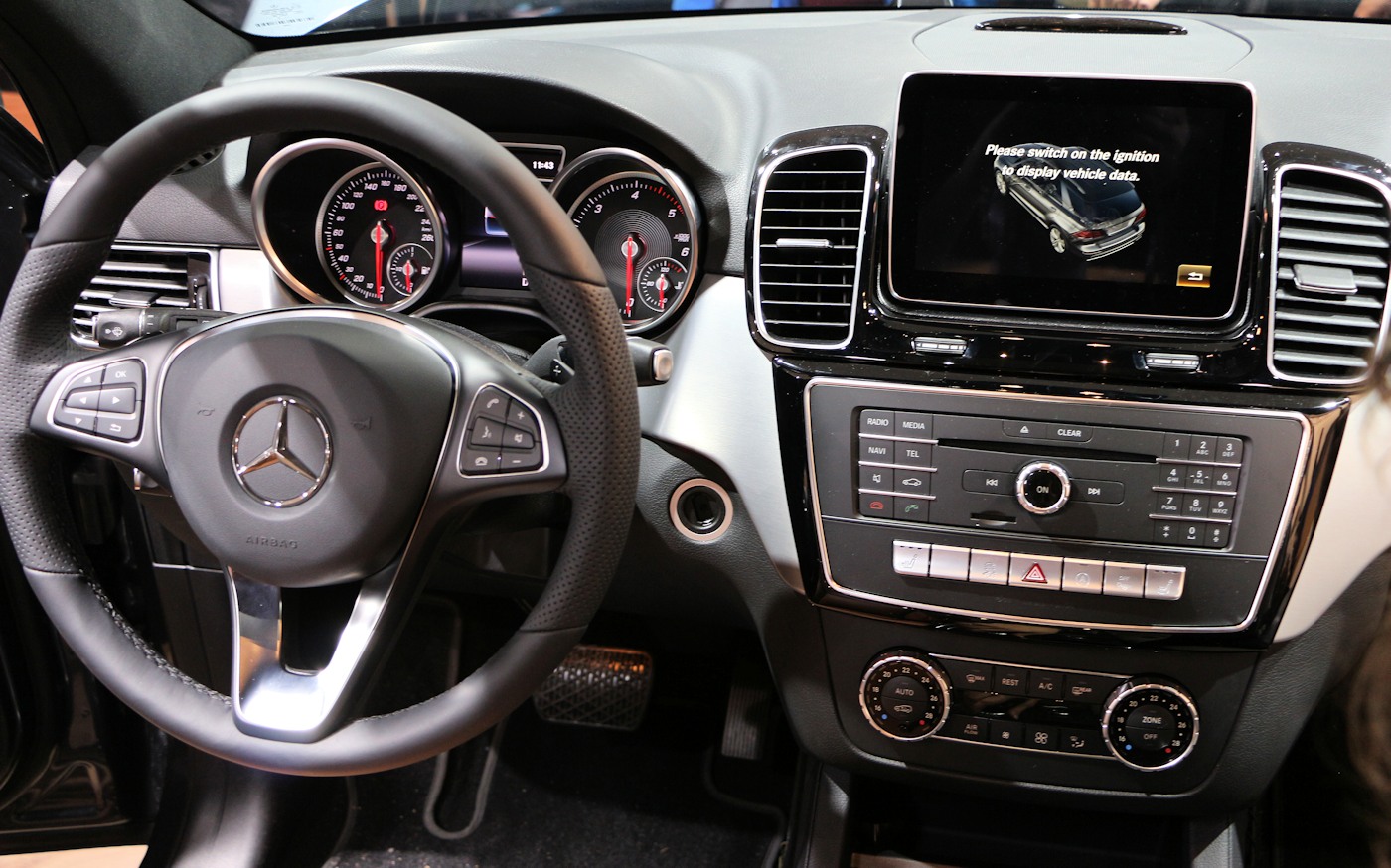 A partir de 72 550 euros : Peinture métallisée // Jantes alliage 51 cm (20") à 5 doubles branches, argent titane, avec monte 265/45 R20 // Vitres latérales arrière et lunette arrière en verre teinté foncé // Pack Exclusif intérieur : Garnitures en cuir - 5 coloris au choix, Sièges avant confort, Planche de bord et bas de glace en ARTICO, Tapis de sol en velours // Pack AMG Line intérieur (code P29) avec garnitures en cuir Nappa disponible sans supplément de prix en substitution du Pack Exclusif intérieur // Éclairage d'ambiance (avec choix de 3 couleurs différentes) // Inserts décoratifs en peuplier noir // Pilote automatique de stationnement : système d'aide au stationnement avec radars de proximité avant/arrière et fonction manoeuvres automatiques // Cache-bagages avec filet vertical de séparation de l'espace de chargement (amovible) (indisponible sur GLE 500 e 4MATIC) // Climatisation automatique confort THERMOTRONIC 3 zones incluant réglages séparés à l'arrière, 3 modes de ventilation (Focus/Medium/Diffus) et buses de ventilation supplémentaires dans les montants B // COMAND Online* avec pavé tactile TOUCHPAD : système multimédia avec écran couleur 21 cm (8") et commande vocale LINGUATRONIC, navigation 3D (cartographie Europe par disque dur intégré avec mise à jour comprise pendant 3 ans), fonction Live Traffic Information (3 ans d'abonnement inclus), assistant de signalisation routière, double tuner radio, lecteur CD/DVD audio/vidéo, deux interfaces USB (dans l'accoudoir central), port de carte SDHC, streaming audio, navigateur internet** , fonction appel d'urgence, notice d'utilisation intégrée et remote Online. // Détecteur d'angle mort // Intelligent Light System (ILS) à LED : projecteurs à technologie LED avec répartition variable de l'éclairage, éclairage actif dans les virages, correcteur dynamique de portée et assistant de feux de route Plus // KEYLESS-GO : démarrage sans clé incluant poignées de porte avec inserts chromés // Pack AIRMATIC // Pack Mémoires : Sièges avant, colonne de direction et rétroviseurs extérieurs tout électrique avec fonction Mémoires, Supports lombaires réglables électriquement côté conducteur et passager (4 positions), Rétroviseur extérieur côté passager incluant fonction d'aide au stationnement // Sièges avant chauffants // Système de sonorisation Surround Harman Kardon® Logic7® : 14 HP dont 4 Surround et 1 subwoofer ; 830 W ; compatibilité DTS et Dolby Digital 5.1 (incompatible avec code 811)