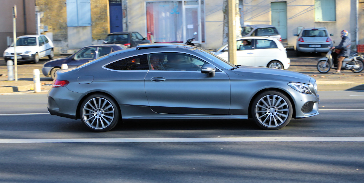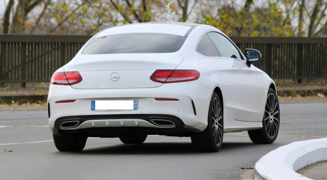 A partir de 41 650 euros : Inserts décoratifs en aluminium // Navigation Garmin® MAP PILOT : navigation 3D sur carte SD (cartographie Europe* ) avec commande vocale, affichage des limitations de vitesse et Live Traffic Information // Rétroviseur intérieur jour/nuit automatique // Sièges avant à réglages partiellement électriques (hauteur du coussin d'assise, inclinaison du dossier) avec réglages lombaires électro-pneumatiques // APA (Aide au Parking Active) : système d'aide au stationnement avec radar de proximité avant/arrière // Jantes alliage 46 cm (18") à 5 branches doubles avec pneus AV 225/45 R18 et AR 245/40 R18 // Projecteurs haute performance à technologie LED (uniquement sur C Coupé) // Rétroviseur extérieur gauche jour/nuit automatique // Rétroviseurs extérieurs rabattables électriquement
