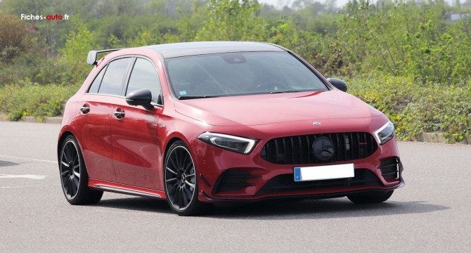 A partir de 50 400 euros : Calandre AMG à double lamelle avec monogramme « AMG » // Jupe avant avec déflecteurs sur les prises d'air extérieures // Inserts chromés sur les lamelles des prises d’air et splitter avant chromé // Jantes alliage AMG de 45,7 cm (18") à 5 doubles branches // Monogramme « TURBO 4MATIC » sur les ailes avant // Sorties d’échappement rondes chromées de 90 mm de diamètre // Jupe arrière AMG avec diffuseur spécifique à quatre lamelles verticales // Déflecteur AMG sur le toit // Volant Performance AMG à 3 branches en cuir Nappa avec méplat dans la partie inférieure, perforations dans la zone de préhension, surpiqûre rouge et repère 12h // Système multimédia MBUX avec menu AMG spécifique et 3 designs d’affichage : Classique, Sport et Supersport // Console centrale AMG en finition noir brillant // Sièges sport avec garnitures en similicuir ARTICO/DINAMICA noir et surpiqûres rouges // Ceintures de sécurité rouge // Inserts décoratifs en aluminium clair à stries longitudinales // Buses de ventilation avec cerclage chromé et insert rouge // 4MATIC Performance AMG // Régulation du comportement dynamique (ESP) à 3 niveaux disponibles via la touche ESP // Système de freinage hautes performances AMG avec étriers de frein dans le ton argent et monogramme AMG noir à l’avant // DYNAMIC SELECT AMG avec 5 programmes de conduite : Chaussée glissante, Confort, Sport, Sport+ et Individual // Boite de vitesses à 7 rapports 7G-DCT SPEEDSHIFT AMG avec fonction RACE START et fonction de double débrayage au rétrogradage // Système d'échappement sport AMG // Direction paramétrique AMG // Train de roulement AMG avec éléments de suspension et d'amortissement spécifiques