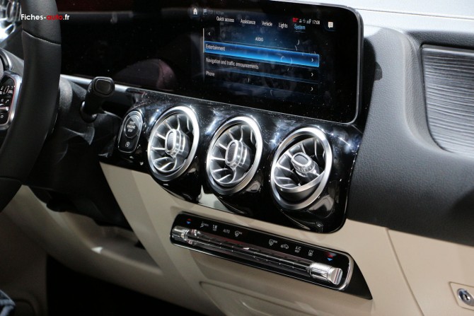 (Source Mercedes mars 2020) De 31 550 à 34 650 euros : ABS (antiblocage de roues), BAS (freinage d'urgence assisté) // ADAPTIVE BRAKE avec fonction HOLD, préremplissage et séchage des freins par freinage en cas de pluie // Airbag genoux côté conducteur // Airbags frontaux pour conducteur et passager avant // Airbags latéraux pour le conducteur et le passager avant (airbags combinés thorax et bassin) // Airbags rideaux // Assistant de franchissement de ligne actif // Assistant de limitation de vitesse par lecture des panneaux grâce à une caméra // Assistant de stabilisation en cas de vent latéral // ATTENTION ASSIST : système de détection de somnolence // Caméra de recul haute résolution (1 280 x 720 dpi) // Capot moteur actif pour la protection des piétons // Capteur de pluie et de luminosité // Ceintures de sécurité 3 points avec rétracteurs pyrotechniques et limiteurs d’eff ort (x4) // Contrôle de la pression des pneumatiques // Désactivation automatique de l’airbag passager avant // Direction paramétrique avec assistance asservie à la vitesse // DYNAMIC SELECT avec les programmes de conduite « ECO (uniquement en liaison avec boîte de vitesses automatique) », « Confort », « Sport » et « Individual » // Feux de stop adaptatifs // Fixations iSize pour siège-enfant avec sangle Top Tether aux places extérieures // Frein de stationnement électrique // Freinage d'urgence assisté actif (alerte visuelle et sonore en cas de risque de collision et freinage d'urgence autonome dans certaines conditions) // Indicateur d'usure des garnitures de frein // Kit TIREFIT // Projecteurs hautes performances à LED // Régulateur de vitesse TEMPOMAT avec limiteur de vitesse // Système d'appel d'urgence Mercedes-Benz // Train de roulement confort // Accoudoir avant // Boîte à gants éclairée // Climatisation automatique THERMATIC à une zone // Connexion Bluetooth® pour téléphone portable // Banquette arrière rabattable (40/20/40) // Double porte-gobelets dans la console centrale avant // Ecran média tactile // Filet au dos des sièges avant // Filet aux pieds du passager avant // Filet sur le plancher de coff re // Fonction de démarrage sans clé KEYLESS-GO // Fonctionnalités élargies MBUX (profi ls personnalisés, fonctions prédictives, borne wifi , webradio) // Hayon EASY-PACK à commande électrique // Interface USB dans le vide-poche & 2 interfaces USB sur la console centrale arrière // Module de communication (LTE) pour l’utilisation des services Mercedes me connect // Pare-soleil avec miroirs de courtoisie éclairés (x2) // Pavé tactile Touchpad // Plancher du coff re amovible et réglable en hauteur // Pré-équipement pour Live Traffi c Information (service gratuit pendant 3 ans après activation Mercedes me) // Pré-équipement pour réglages et suivi du véhicule à distance (service gratuit pendant 3 ans après activation Mercedes me) // Pré-équipement pour service d'autopartage (service gratuit pendant 3 ans après activation Mercedes me) // Prise 12 V dans le vide-poches // Prise 12 V dans l'espace de chargement // Range-lunettes dans l'unité de commande au toit // Sièges confort à l'avant // Système de commande vocale et assistant personnel activable grâce à "Hey Mercedes" // Système multimédia MBUX avec deux écrans de 18 cm (7") off rant une résolution de 960 x 540 pixels // Tapis réversible dans l'espace de chargement // Radio digitale DAB // Ciel de pavillon en tissu noir // Garnitures en tissu/similicuir ARTICO noir // Inserts décoratifs façon ellipse // Poignées de portes peintes en noir brillant // Tapis de sol en velours // Volant sport multifonction en cuir // Diff useur noir avec baguette chromée horizontale // Grille de calandre avec double lamelle fi nition argent et insert chromé // Jantes alliage 43,2 cm (17") à 5 doubles branches gris Himalaya mat // Jupe avant avec insert chromé