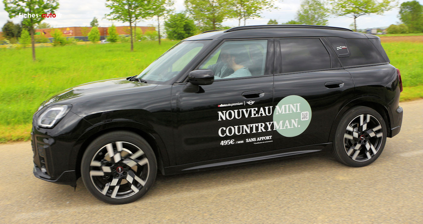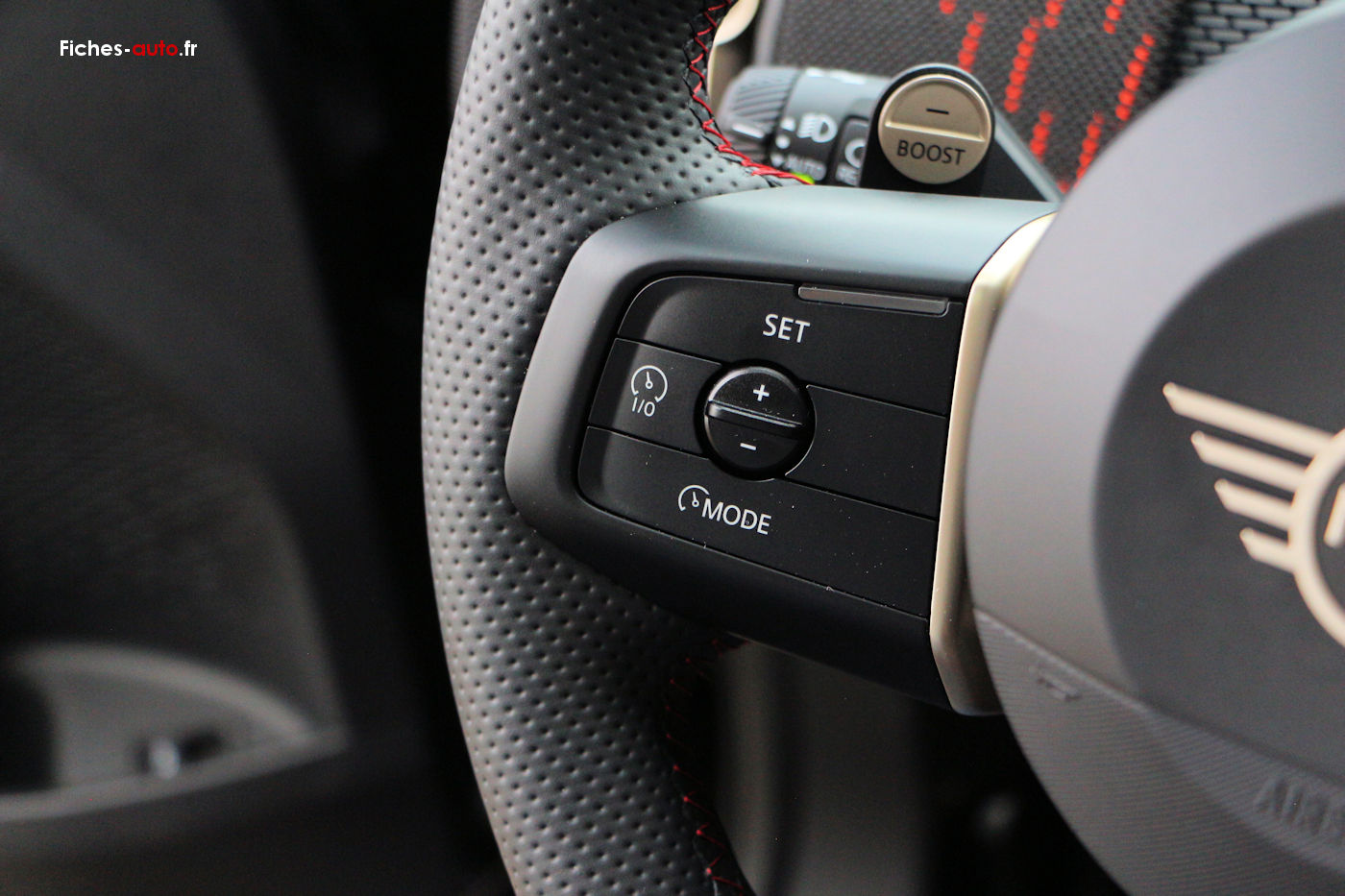 (Source Mini juillet 2024) A partir de 43 000 euros : Feux avant et arrière à diodes électroluminescentes (LED) // Barres de toit noir brillant // Jantes en alliage // Unité d'interaction MINI - écran OLED circulaire de 24 cm de diamètre // Modes MINI - Core, Green et Go-kart avec interface utilisateur spécifique // Tuner DAB // Climatisation automatique à 2 zones, bouches d'aération réglables à l'arrière // Transmission à 7 vitesses, double embrayage // Assistant de conduite : Assistance au maintien de la trajectoire avec détection des angles morts, prévention des collisions arrières et alerte de sortie de véhicule // Alerte de collision avant avec intervention sur les freins // Informations sur les limitations de vitesse et assistance aux limitations de vitesse // Régulateur de vitesse dynamique // Assistant de stationnement avec contrôle actif de la distance de stationnement et caméra de recul // Aide à l'inversion // Assistant de remorquage (avec attelage en option) // Télé-services // Appel d'urgence // Boulons de route anti-vol // Kit de réparation de pneus // Triangle d'avertissement // Commodité // Ouverture/fermeture complète du hayon par simple pression d'un bouton // MINI Navigation // "MINI Intelligent Personal Assistant" - fonctionnement et interaction vocale // Intégration des smartphones : Apple Car Play & Android Auto // Personal eSim // Services à distance - Utilisation des fonctions du véhicule à partir du téléphone portable // Détecteur de pluie avec buses de lave-glace chauffantes // Rétroviseurs extérieurs chauffants et réglables électriquement // Système de chargement traversant avec banquette arrière divisée 40:20:40 et inclinaison réglable du dossier de la banquette arrière // Points d'ancrage i-Size pour le passager avant et les sièges arrière extérieurs, et désactivation de l'airbag du passager avant // Tapis de sol en velours