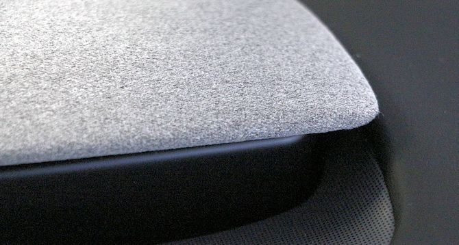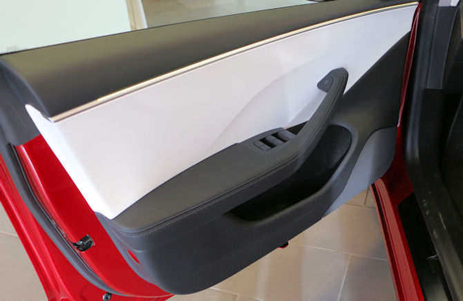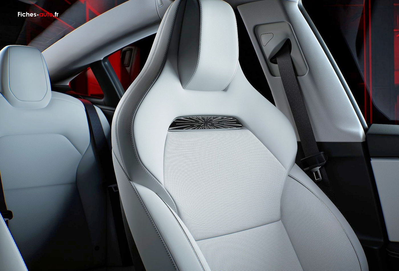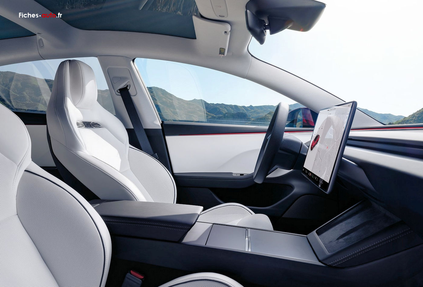 Notons qu'on a désormais trois intérieurs différents même si ces différences restent très ténues (car tous les habitacle ont la même planche de bord avec le tissus gris qui la surplombe). Il y a tout d'abord l'entrée de gamme dotée de tissus gris sur les contre-portes ou encore le cuir blanc si vous optez pour l'intérieur blanc optionnel (attention, on n'a pas de gros caisson de basse dans cette version, réduisant la qualité sonore de manière significative). La Long Range / Grand Autonomie offre deux configurations, sans possibilité d'opter pour le tissus gris si vous avez eu le coup de coeur dessus ... Les versions plus haut de gamme ont donc au choix un intérieur dont les contre-portes sont en Alcantara (pas la marque officielle mais c'est un détail) ou en cuir blanc pour l'intérieur blanc. Notez au passage que les contre-portes en blanc ne sont pas judicieusement placées car les mains finissent forcément par salir le cuir blanc immaculé ... L'Alcantara sera bien plus adapté pour se positionner ici.