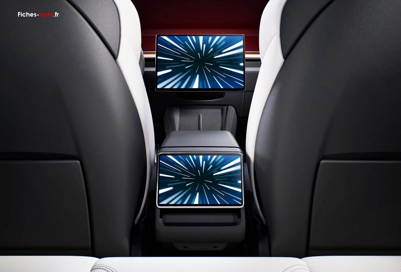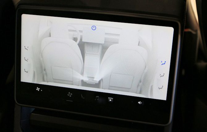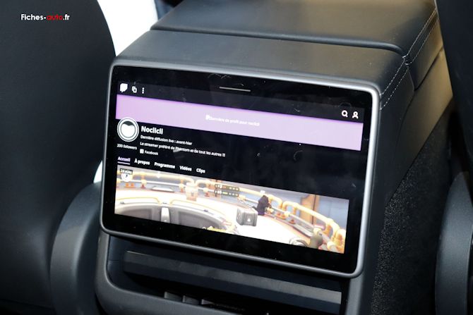 On a en plus à l'arrière un petit écran arrière de 8 pouces qui permet aux passagers de régler eux-mêmes la ventilation et l'orientation de cette dernière (avant c'était avec une commande mécanique, sans possibilité toutefois de gérer la force du flux : uniquement l'orientation du souffle). Il y a aussi la possibilité d'avancer ou reculer le siège avant droit (pas du conducteur évidemment) comme c'est le cas sur les limousines. Ces derniers peuvent utiliser les fonctionnalités de jeu et "cinéma" Youtube, Netflix etc.) même quand l'auto avance. Par la suite arrivera la possibilité d'écouter avec un casque pour ne pas gêner le conducteur. Le son peut aussi être divisé en deux, avec la radio écoutée à l'avant et Youtube à l'arrière par exemple. Il est aussi possible, bien évidemment, de verrouiller l'écran depuis l'avant si vous souhaitez que les enfants n'y touchent plus.