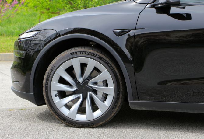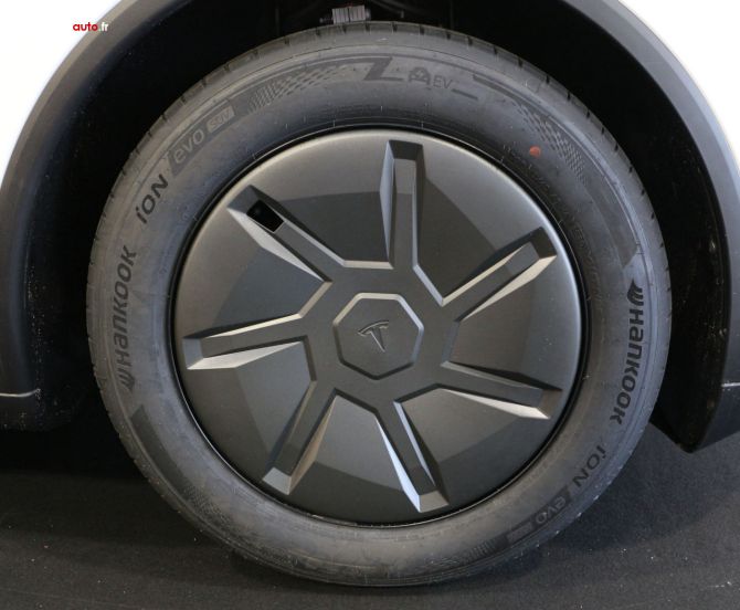 Nouvelle donnée 2025 : la déclinaison Model Y Standard passe en 235/55 R18. On se retrouve avec des pneus plus étroits et des flancs plus hauts, ce qui dégrade la précision et la rigueur du train avant. Jamais un Model Y n'avait été en dessous de 255 mm de large, on perd ici en tenue et en ressenti, surtout associé à une suspension plus conciliante.