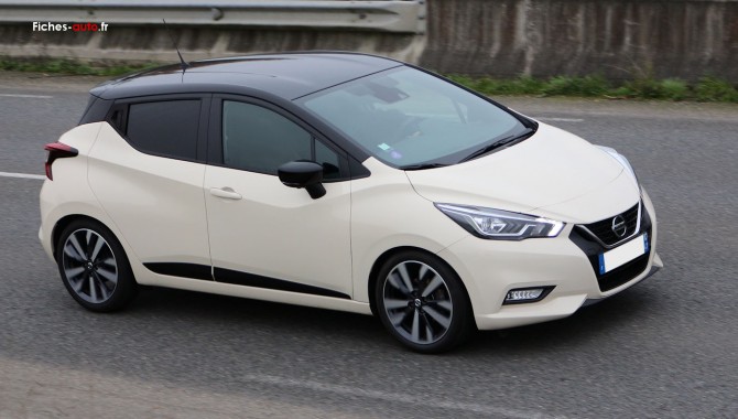 (Source Nissan Octobre 2017) A partie de 13 590 euros : ESP / ABS / EBD / NBAS / Freinage d'urgence intelligent (AEB) / 6 airbags (frontaux, latéraux avant et rideaux), airbag passager déconnectable / Système de contrôle de pression des pneus (TPMS) / Aide au démarrage en côte / Allumage intelligent des phares / Feux diurnes LED / Fixations ISOFIX à l'avant et à l'arrière / Avertisseur de ceintures de sécurité / Feux de détresse à déclenchement automatique / Jantes acier 15" avec enjoliveurs / Poignées de portes arrière intégrées dans le montant à l'arrière / Poignées de portes extérieures noires à l'avant / Rétroviseurs extérieurs noirs avec indicateurs de changement de direction / Spoiler arrière / Feux de route halogène avec signature lumineuse / Sellerie tissu noir / Accoudoir des contre-portes avant en tissu / Partie supérieure du tableau de bord moussée / Rétroviseurs extérieurs réglables électriquement et rabattables manuellement / Ouverture et fermeture centralisées des portes à distance / Vitres électriques à l'avant / Indicateur de changement de rapport / Volant réglable en hauteur et en profondeur / Siège conducteur réglable en hauteur / Banquette arrière 60/40 rabattable / Repose-genoux rembourrés avec surpiqûres / Prise 12V (x1) / Bacs de rangement dans les contre-portes avant et arrière / Porte-bouteilles dans les contre-portes avant / Porte-gobelets (2 à l'avant et 1 à l'arrière) / Éclairage intérieur et illumination des commandes de vitres électriques / Pare-soleil côté conducteur et passager avec miroir de courtoisie / Appuis-tête avant ajustables / 2 appuis-tête arrière / Éclairage de coffre / Ordinateur de bord avec capteur de température extérieure / Limiteur de vitesse / Intelligent Trace Control / Intelligent Ride Control