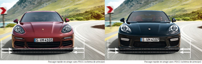 Ces deux choses là sont vendues ensemble dans un même pack, le premier (PDCC) consiste à greffer un petit moteur électrique sur le milieu de la barre anti-dévers. Cela permet de la rendre plus ou moins rigide afin de lier plus ou moins les trains de gauche et de droite. En gros cela permet de virer quasiment totalement à plat dans les virages et donc d'anéantir toute sensation de tangage et de roulis. Un réel plus pour la Sportivité et il faut avouer que c'est ainsi équipée que la Panamera commence vraiment à bluffer son monde (le Cayenne en profite aussi).