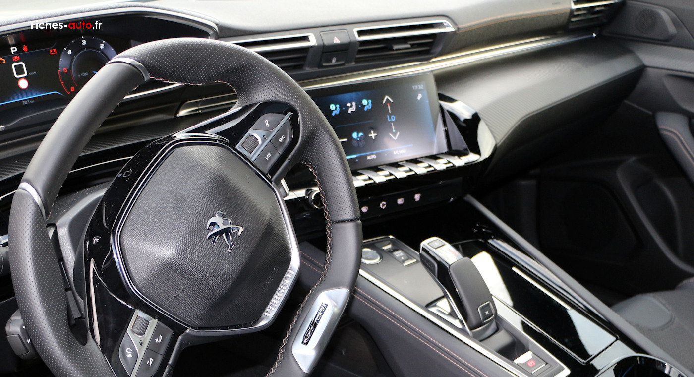 A partir de 41 200 euros : Projecteurs 'Peugeot Full LED Technology' avec éclairage en virage statique // Feux 3D Full Led adaptatifs // Jantes alliage 18'' Hirone bi-ton diamantées et vernis Grey Dust // Boitiers de rétroviseurs extérieurs noirs brillants // Calandre à damier chromé et contour chromé // Jupe de pare-chocs arrière noire brillante // Pourtour de vitres latérales noirs brillants // Habitacle et ciel de pavillon noir // Pédalier et repose-pied en aluminium // Planche de bord surpiquée // Seuils de portes avant en Inox // Volant cuir fleur perforé avec bagues chromées et badge GT Line // Eclairage d'ambiance bleu sur planche de bord, panneaux de porte et console centrale // Peugeot i-Cockpit® Amplify* // Rétroviseur intérieur photosensible frameless (sans cadre) // Sellerie Tissu Belomka Noir / TEP Noir // Sièges conducteur et passager certifiés AGR*