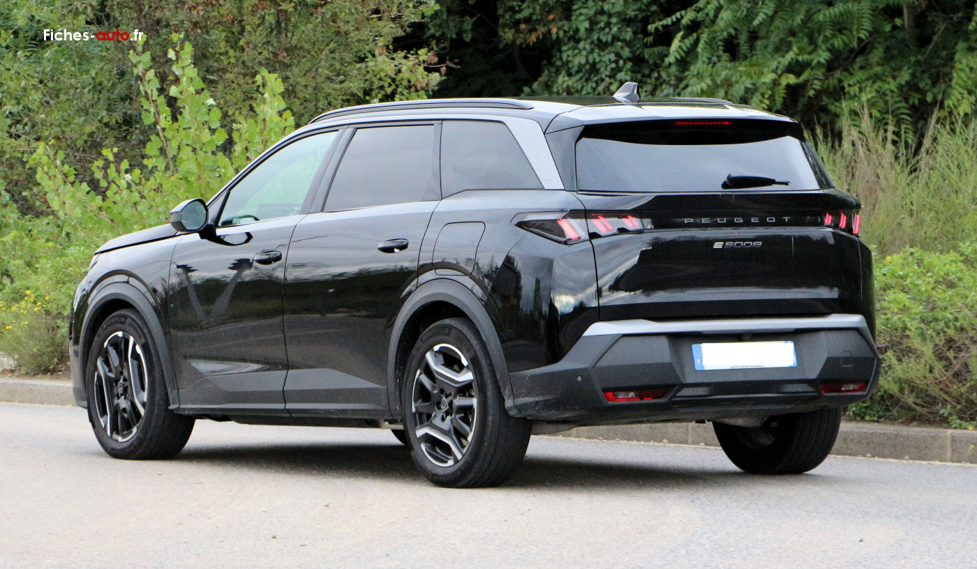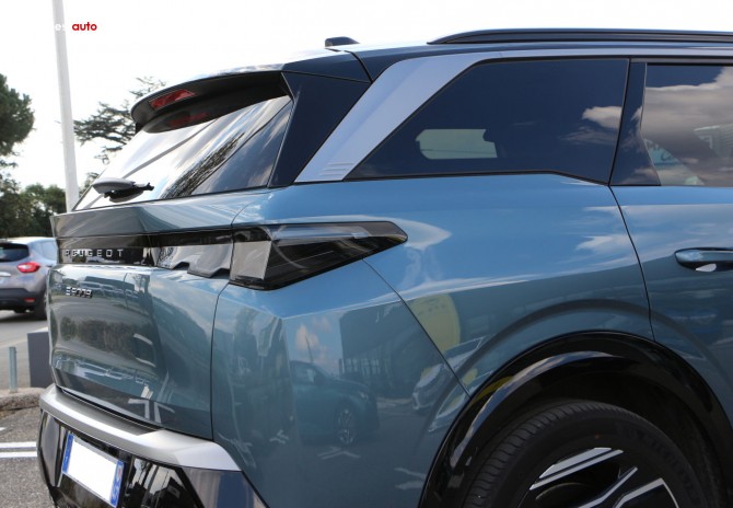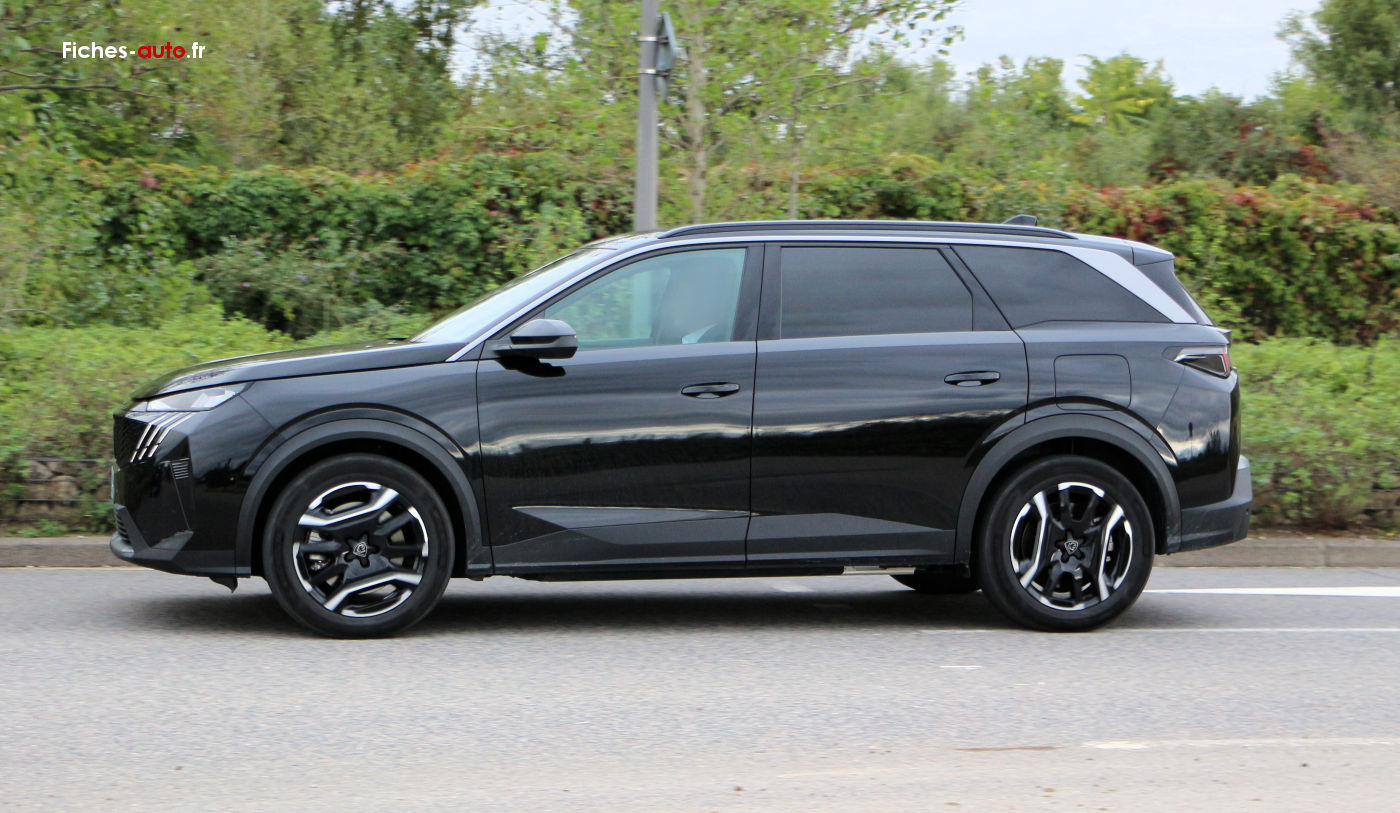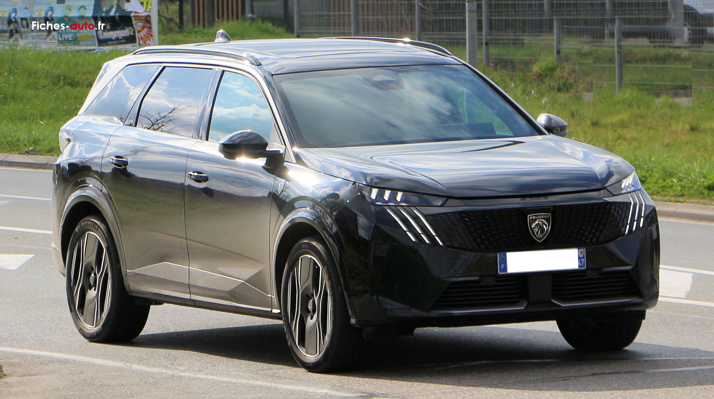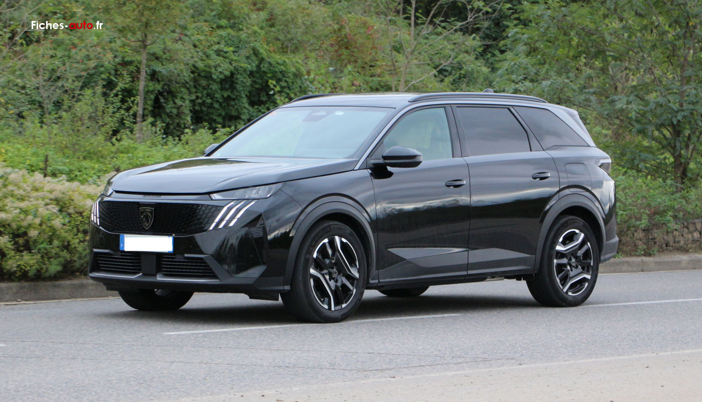 (2025) A partir de 40 490 euros : 6 Airbags // ESP avec aide au démarrage en pente et détection de sous-gonflage indirecte // Fixations ISOFIX et Top Tether aux places latérales rang 2 // Feux arrière 3 griffes à LED // Projecteurs PEUGEOT LED Technology, feux diurnes 3 griffes à LED // Pack Safety Plus // Régulateur / Limiteur de vitesse // Freinage d'urgence automatique avec alerte risque de collision, pilotée par caméra et radar // Alerte active de franchissement involontaire de ligne et bas-côté // Reconnaissance étendue des panneaux de signalisation et préconisation de vitesse // Alerte attention conducteur // Visiopark 1 : caméra de recul HD & aide au stationnement arrière, graphique et sonore // Accès et démarrage mains libres Proximity // 2 Télécommandes 3 boutons (verrouillage, coffre, déverrouillage) // Air conditionné automatique bi-zone // Allumage automatique des projecteurs // Essuie-vitre avant à déclenchement automatique // Eclairage intérieur : plafonnier avant et liseuses arrière à LED, boîte à gants et rangement de console éclairés à LED, éclairage des caves à pieds avant à LED // Frein de stationnement électrique // Lève-vitres avant et arrière électriques, séquentiels et antipincement // Pare-brise feuilleté acoustique // PEUGEOT i-Cockpit® panoramique avec double écran HD flottant (2 x 10'') // Plancher de coffre modulable 2 positions // 4 poignées de maintien rétractables // Rétroviseur intérieur électrochrome // Rétroviseurs extérieurs dégivrants à réglage et rabattement électriques, éclairage de seuil // Banquette rang 2 coulissante 60/40, avec dossiers inclinables et rabattables 40/20/40, avec fonction Easy Access aux places du rang 3 // Banquette 2 places au rang 3 avec dossiers rabattables 50/50 // Siège conducteur et passager avec réglage en hauteur manuel // Sellerie tissu CRISPY embossé // PEUGEOT i-Connect® // Radio DAB, Bluetooth® (connexion de 2 téléphones) // Mirror Screen sans fil (Apple CarPlay / Android Auto) // Peugeot Connect SOS & Assistance // 1 prise USB-C (Data & charge) // Connect One (abonnement 10 ans inclus) : fonctionnalités principales à bord (mises à jour Over The Air, géolocalisation), services de sécurité (appel d’urgence, Peugeot Assistance), services d’entretien (télémaintenance, guide d’utilisation digital) // Connect Plus (abonnement 6 mois inclus, renouvellement 8 €/mois) : services de sécurité avec alarme connectée (si le véhicule en est équipé), services à distance (E Remote Control, Remote Control, Find My Car, My Trip Report, Peugeot Skill for Alexa) // e-ROUTES par Free2move charge // 6 haut-parleurs : 2 tweeters et 2 woofers à l'avant, 2 haut-parleurs large bande à l'arrière // 3 prises 12 V (console centrale, rang 2, coffre).