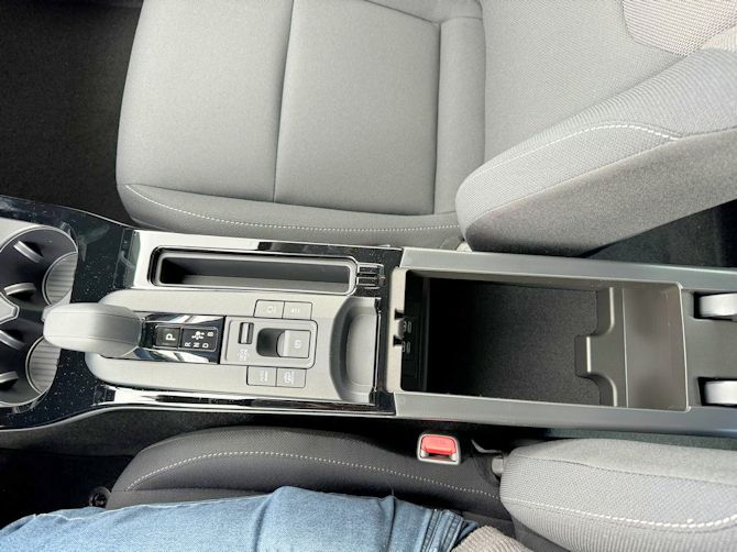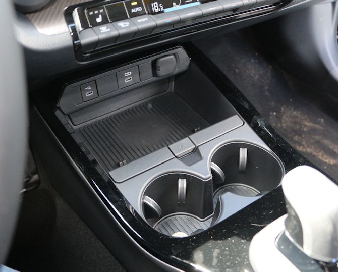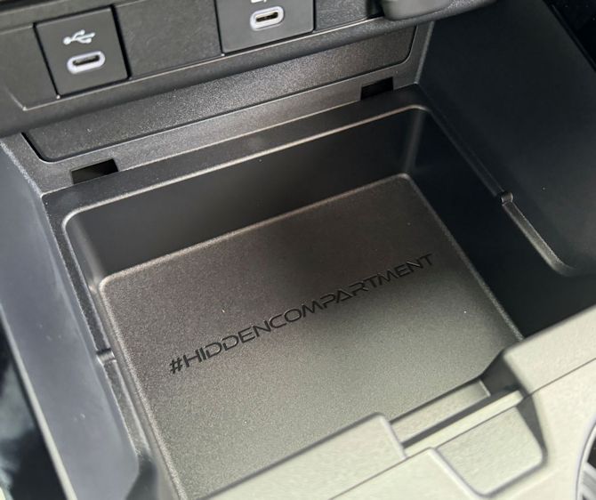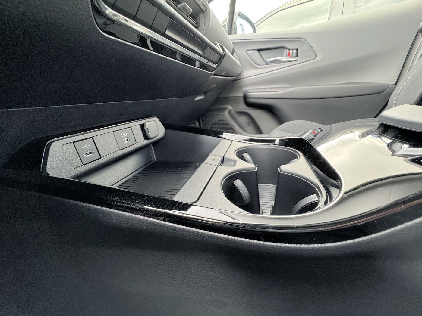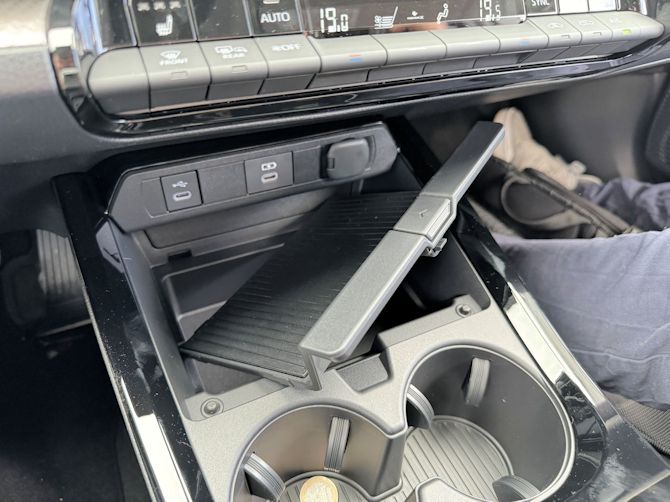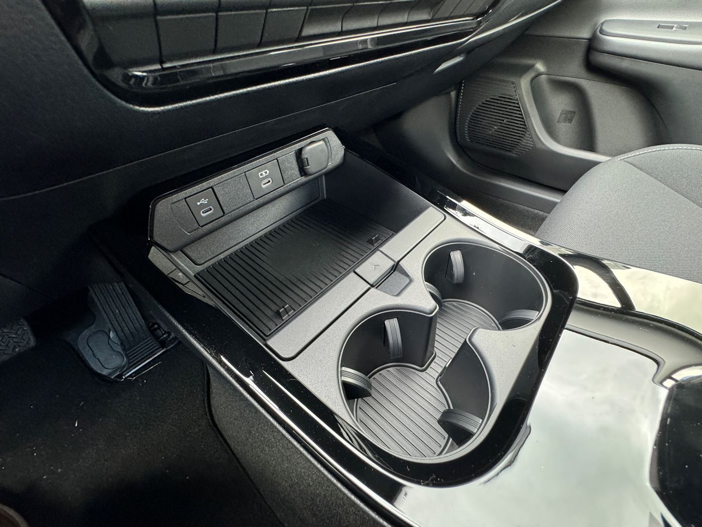Tout à l'avant de la console, on a un petit bac à découvert qui ressemble à une recharge par induction qui est surplombée par deux prises USB-C et un allume cigare. Sous ce rangement se trouve un deuxième rangement caché, et le "sol" du rangement supérieur sert de couvercle. Juste derrière se situe un porte-gobelets qui ne sert qu'à ça (sur les concurrentes la mode consiste à les rendre modulaires pour qu'ils puissent servir de rangement rectangulaires). Ils ont le mérite de bien caler les gobelets grâce à des appendices qui dépassent.