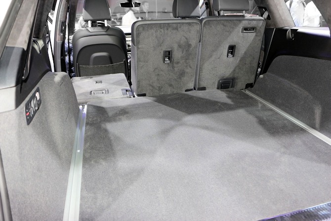 Niveau modularité le Q7 offre un plancher totalement plat quand on rabat les sièges dans le plancher, le volume est alors de 2075 litres soit à peu près la valeur de l'ancien (un tout petit peu mieux, mais pas de quoi le voir à l'oeil). Les 6ème et 7ème sièges se déplient de manière électrique, niveau de gamme oblige ...