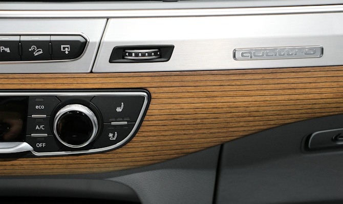 Sans être décevante, la présentation peut un peu trop faire penser à une A4, voire même une Passat depuis qu'elle bénéficie elle aussi d'aérateurs courant tout le long de la planche de bord. Bref on a vu plus chic comme référence ! Malgré tout ça reste très finement réalisé malgré la présence de (rares) plastiques durs qui rappellent largement les gammes inférieures. La présence de boiseries réelles et de pièces en métal viennent amener de la prestance à l'auto, dommage que l'habillage de l'intérieur puisse faire autant exploser la facture (de 5000 à 15 000 euros quand même !) ... Un pack "Audi design selection brun murillo" coûte en option tout de même15 500 euros si on part du premier niveau de finition et 11 300 euros si on part de la plus haute finition (hors SQ7).