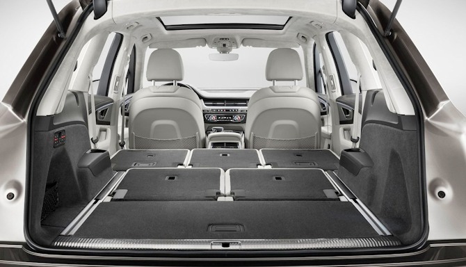 Le volume de coffre atteint 890 litres si on intègre les rangements sous plancher (et même un peu plus si on a la banquette coulissant qui peut s'avancer). Ce dernier tombe à 770 litres en 7 places quand seulement 5 places sont déployées (les sièges encastrés prennent donc 120 litres au rangement sous plancher). La version e-tron n'a quant à elle aucun vide sous le plancher et le volume s'établit alors à 650 litres, c'est donc le volume disponible au dessus du plancher du coffre jusqu'au seuil de la plage arrière.