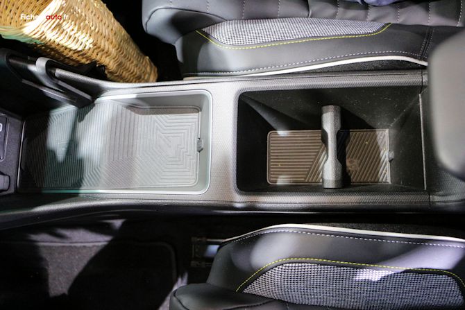 À l'avant, l'aménagement est assez simple mais fonctionnel. On retrouve une console centrale avec deux porte-gobelets, un vide-poche central et un emplacement pour smartphone avec recharge à induction. Cette dernière demande parfois de bien positionner le téléphone pour fonctionner correctement, ce qui n'est pas idéal. Les rangements sont présents mais restent assez basiques, sans vraie générosité.