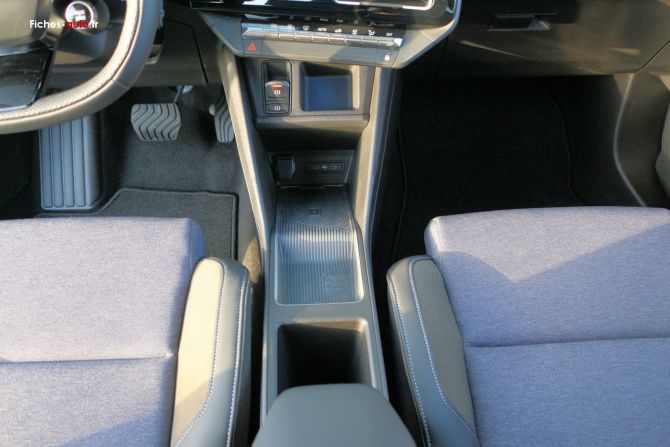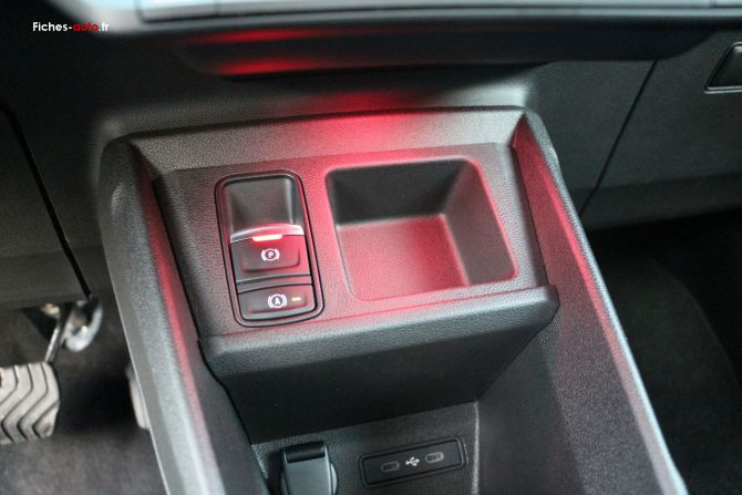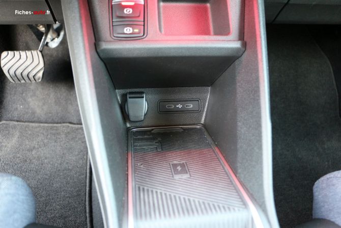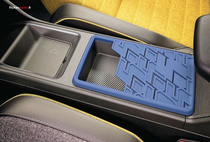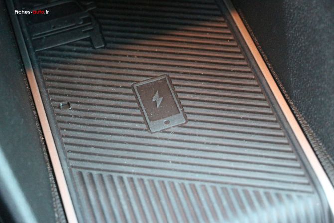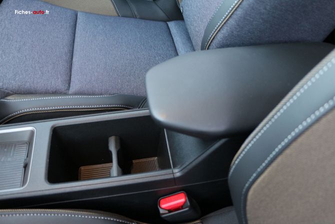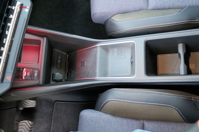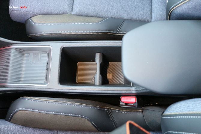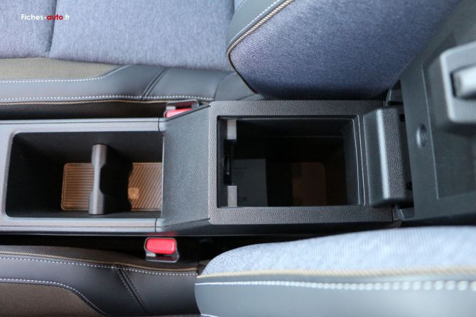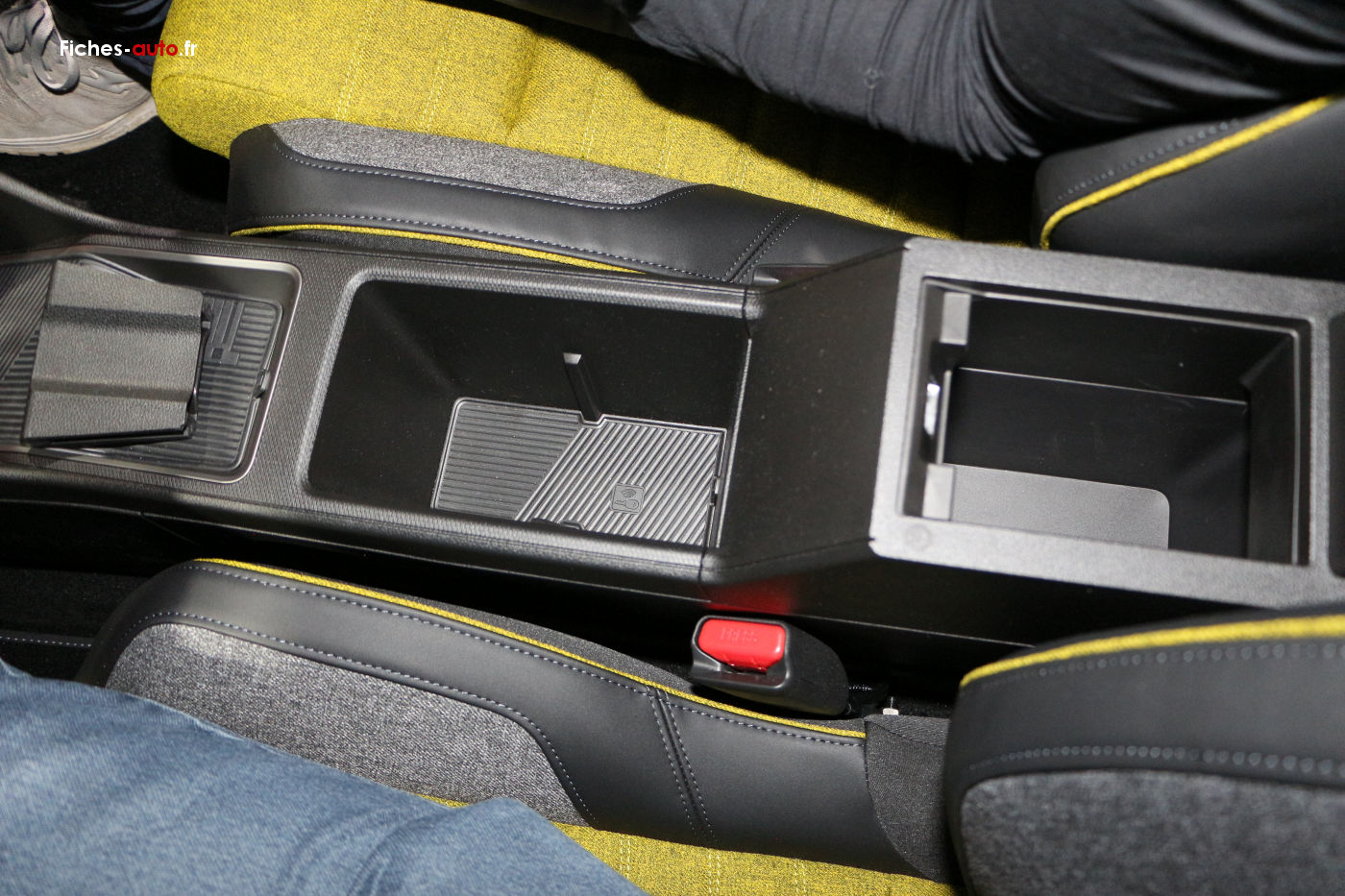 pour résumer, on a à l'avant un bac ouvert qui sert de chargeur par induction et qui a en dans le fond des prises allume-cigare et USB-C. Au dessus de ce dernier se situe un mini logement qui semble être destiné à vos pièces de monnaie. Derrière suit un autre bac de rangement encore une fois ouvert et visible de tous qui peut être fractionné en deux grâce à une cloison amovible en plastique. Notez que cet emplacement peut accueillir des bacs de rangement personnalisés vendus en tant qu'accessoire, et qu'on peut alors cacher un peu plus les affaires qui s'y trouvent. Suit enfin l'accoudoir qui est d'une taille modeste.