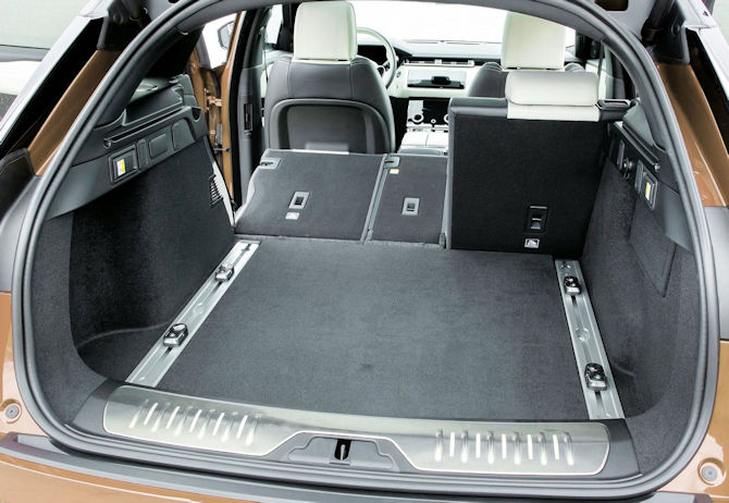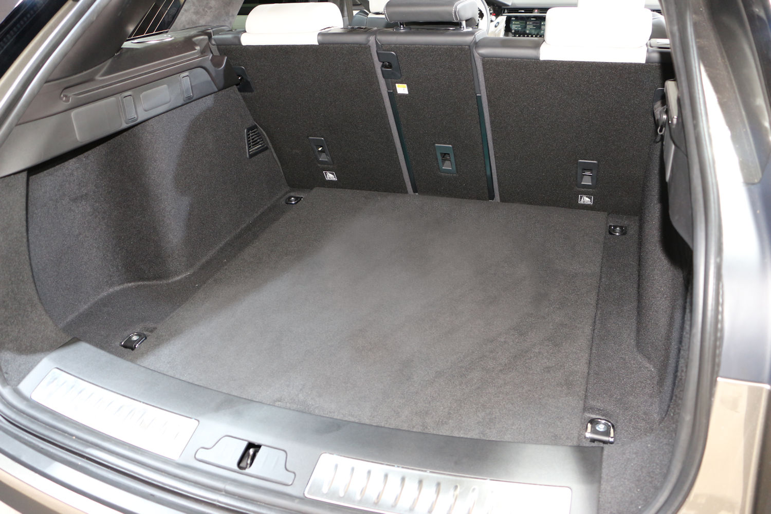 C'est finalement assez basique bien que la banquette arrière se fractionne en trois parties. On peut évidemment les rabattre dans le plancher ce qui donne lieu à un plancher quasi plat et un volume total jusqu'au toit de 1731 litres. N'espérez cependant pas de banquette coulissante, elle ne fait pas partie du plan du Velar.
