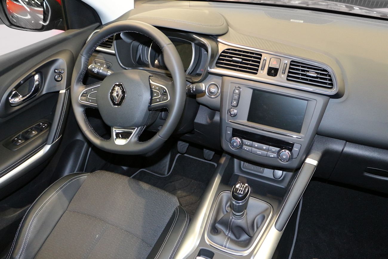 (Source Renault PDF) ABS + AFU, Airbags frontaux conducteur et passager adaptatifs (airbag passager déconnectable), Airbags latéraux bassin/thorax conducteur et passager avant, Airbags rideaux de tête aux places avant et arrière, Ceinture centrale arrière 3 points, Condamnation automatique des ouvrants en roulant, Condamnation centralisée des ouvrants, Condamnation portières arrière mécanique, ESC avec ASR, Kit de réparation de pneus, Pré-équipement alarme, Système de fixations ISOFIX aux places latérales arrière, Système de surveillance de la pression des pneus, Témoin d’oubli de ceinture de sécurité, Aide au démarrage en côte, Clignotants à impulsion, Indicateur de changement de vitesse, Instrumentation TFT couleur 7", Programme eco mode, Projecteurs antibrouillard, Régulateur et Limiteur de vitesse, Accoudoir central avant, Appuis-tête avant réglables en hauteur, 3 appuis-tête arrière réglables en hauteur, Climatisation manuelle et filtre d’habitacle / Aérateurs aux places arrière, Éclairage de coffre, Lève-vitre conducteur avant électrique à impulsion, Lève-vitres passager et arrière électriques, Prise 12 volts, à l’avant et sur la console centrale au rang 2, Rétroviseurs extérieurs électriques et dégivrants, Siège conducteur réglable en hauteur, Spots de lecture avant et arrière, Volant réglable en hauteur et en profondeur, Radio, CD MP3, Bluetooth®, reconnaissance vocale, prise USB & jack, Banquette arrière 1/3 - 2/3, Poches aumônières au dos des sièges, Entourages de vitres chromés, Jantes alliage 17" Impulsion, Passages de roues et boucliers avant et arrière plastique injecté, Poignées de porte ton caisse, Projecteurs avant avec guides de lumière intégrés, Skis avant et arrière injectés noir, Décors intérieurs noir brillant, Sellerie Tissu Carbone foncé, Surtapis, Volant et pommeau de levier de vitesse cuir*