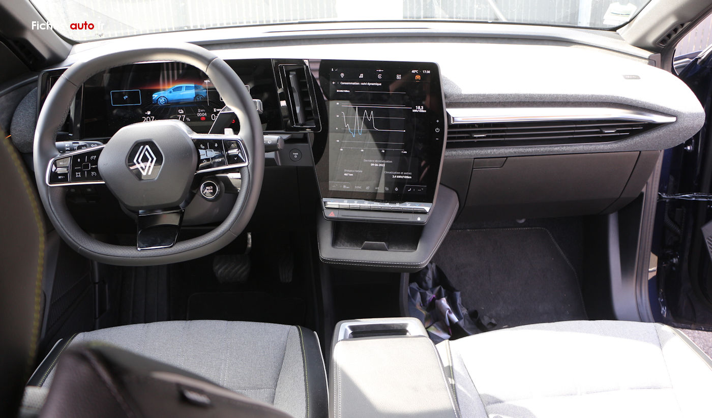 A partir de 38 200 euros : Alerte de survitesse // Commutation automatique des feux de route/ croisement avec détecteur antibrouillard // Détecteur de pluie // Phares adaptatifs avec fonction antibrouillard // Rétroviseur anti-éblouissement // Écran multimédia OpenRLink 12” avec navigation et services Google // Système audio Arkamys® avec 6 haut-parleurs // 2 ports USC-C à l’arrière // Chargeur à induction // Climatisation automatique // Console centrale haute avec accoudoir et porte-gobelet additionnel // Lumière d’ambiance // Multisense 4 modes de conduites (perso/sport/ confort/éco) // Volant cuir chauffant // Antenne Requin // Feux arrière avec effet moirage et clignotants défilants // Jantes alliage 20’’ diamantées Soren // Rétroviseurs extérieur noir brillant // Rétroviseurs rabattables électrique avec éclairage acceuil LED avec projection logo Renault // Toit bi ton et lécheurs de vitres chromés // Vitres arrière surteintées // Finition planche de bord et panneau de portes en alcantara // Décoration haut de planche en alcantara // Rétroviseur intérieur électrochrome sans contour // Sellerie mixte simili cuir / textile recyclé ELZA REC gris chiné