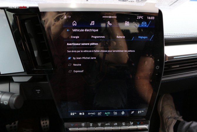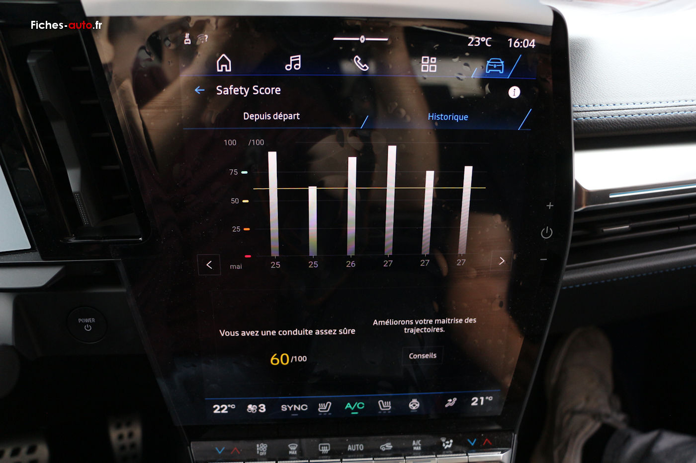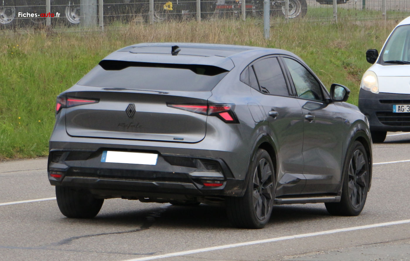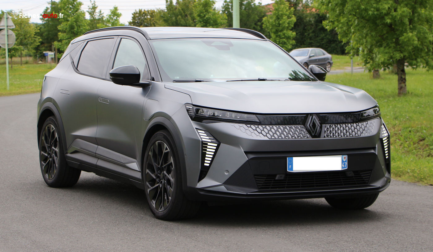 A partir de 41 990 euros : Rétroviseurs extérieurs rabattables électriquement avec éclairage d’accueil à LED en projection logo Renault // vitres arrière surteintées // pièces décor boucliers avant et arrière hyper métal satin // accoudoir arrière ingenius® (trappe à skis incluse) avec 2 ports USB-C // chargeur à induction // cluster digital 12,3” et openR link 12” : système multimédia connecté avec Google intégré (Google Maps et Google Assistant) pendant 5 ans et pack infotainment (Google Play) avec 3 Go inclus (pendant 6 mois)* // rétroviseur intérieur jour/nuit automatique sans bord // sellerie tissu recyclé gris chiné/textile enduit grainé recyclé noir titane avec surpiqûres jaunes // multi-sense et ambiance lumineuse intérieure avant et arrière // volant en textile enduit grainé biosourcé et recyclé avec insert perforé et décor chrome satin // hayon motorisé // feux LED adaptive vision avec fonction antibrouillard // aide au parking avant et latéral // programmation trajet électrique avec Google Maps* // préconditionnement de la température batterie en roulant (avant une charge rapide DC) // freinage régénératif (4 niveaux) réglable par palettes au volant // pack advanced driving assist (inclut volant chauffant)
