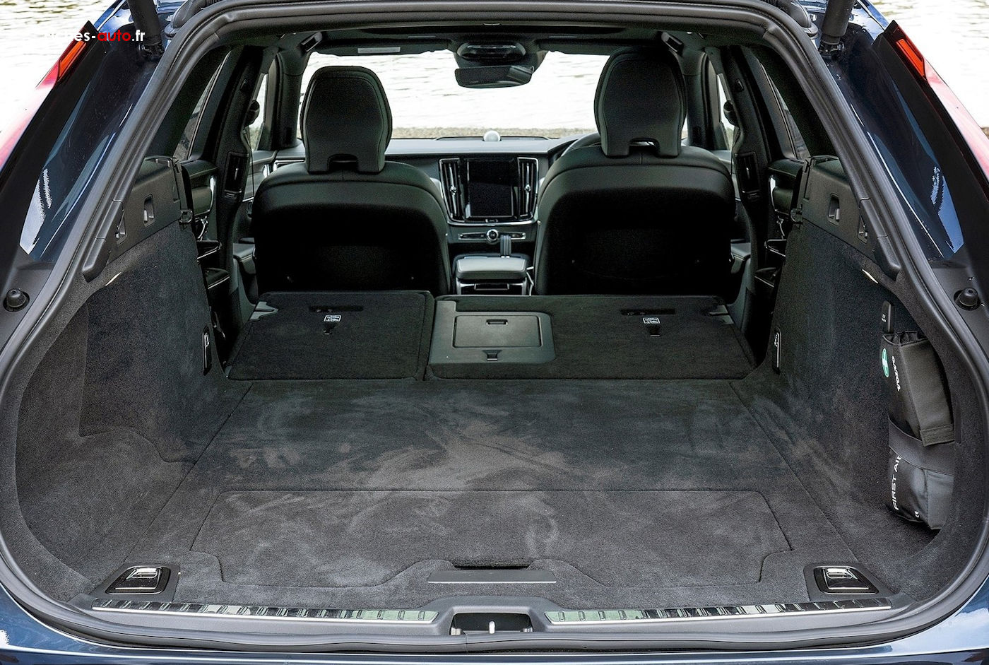 Coffre du break : 560 litres. La version break V90 Estate offre un volume de coffre de 560 litres (contre 500 sur la berline tricorps). En comptant l'espace au dessus de la plage arrière on arrive à un total de plus de 720 litres ... Enfin, le break est un peu plus haut avec 3 cm supplémentaires mais se révèle en revanche plus court de 3 cm aussi.