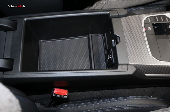 Les rangements sont en nombre insuffisants et on voit bien ici qu'on a affaire à un habitacle qui date en terme de philosophie. Il est en effet calqué sur ce que l'on fait depuis une trentaine d'années dans l'automobile. On a donc un petit rangement fermable (mais dont la trappe fait cheap au ressenti) à l'avant de la console centrale dans lequel se trouvent des portes-gobelets et une recharge par induction.