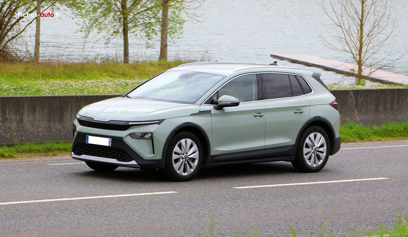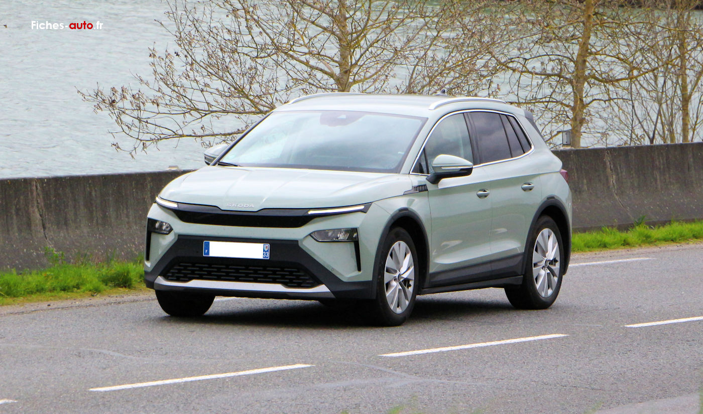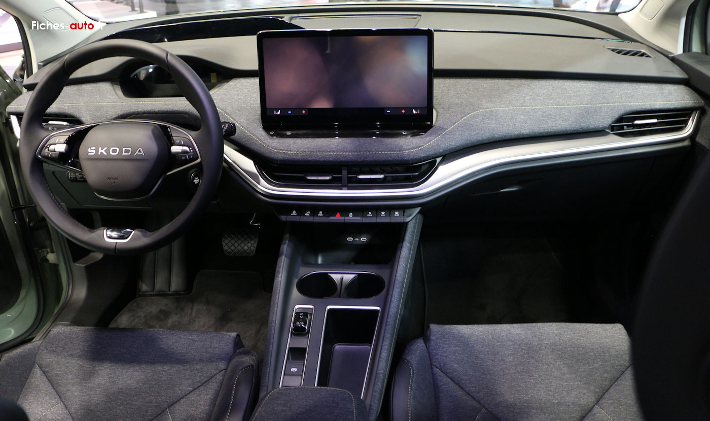 (Source Skoda 2025) A partir de 33 430 euros : Antenne type aileron de requin // Feux avant LED avec allumage automatique // Feux arrière LED // Feux de jour LED // Clignotants LED // Rétroviseurs extérieurs réglables électriquement, chauffants et rabattables électriquement // Vitres arrière et lunette arrière surteintées // Rampes de pavillon noires // Jantes alliage 19 pouces avec pneus 235/55 R19 // Capteur de pluie // Capteur de luminosité // Caméra de recul // Aide au stationnement arrière // Digital Cockpit 5.3 pouces // Système d’infodivertissement avec écran tactile 13 pouces // Navigation avec planificateur d’itinéraire recharge // Apple CarPlay et Android Auto // Radio numérique DAB // Commandes audio au volant // 2 ports USB-C avant (15 W) // Prise 12 V dans le coffre // Climatisation automatique bi-zone Climatronic // Accoudoir central avant // Accoudoir arrière avec porte-gobelets // Volant multifonctions en cuir // Sièges avant chauffants // Sellerie tissu // Siège conducteur réglable en hauteur // Banquette arrière rabattable 60/40 // Fixations Isofix arrière // Front Assist (freinage automatique d’urgence) // Lane Assist (maintien dans la voie) // Crew Protect Assist (pré-tension des ceintures en cas de danger) // Régulateur de vitesse // Limiteur de vitesse // Système de contrôle de pression des pneus // Airbags frontaux, latéraux et rideaux // Airbag central avant // eCall appel d’urgence // Kessy Go (démarrage sans clé) // Parapluie intégré dans la portière // Rangement pour câble de recharge dans le coffre.