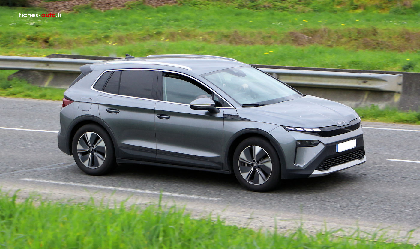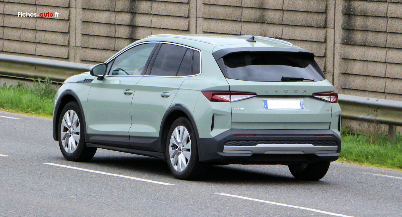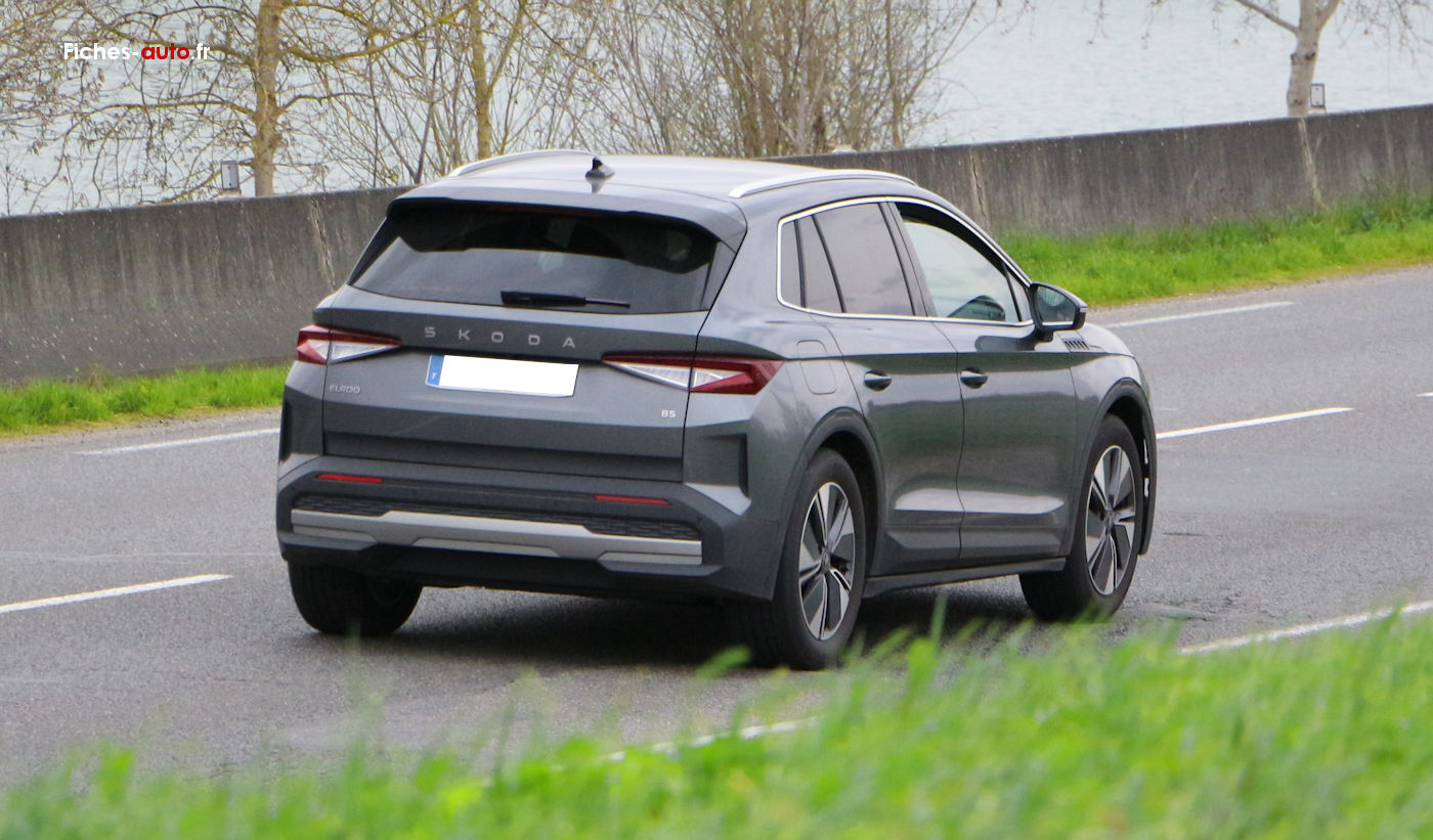 (Source Skoda 2025) A partir de 33 430 euros : Antenne type aileron de requin // Feux avant LED avec allumage automatique // Feux arrière LED // Feux de jour LED // Clignotants LED // Rétroviseurs extérieurs réglables électriquement, chauffants et rabattables électriquement // Vitres arrière et lunette arrière surteintées // Rampes de pavillon noires // Jantes alliage 19 pouces avec pneus 235/55 R19 // Capteur de pluie // Capteur de luminosité // Caméra de recul // Aide au stationnement arrière // Digital Cockpit 5.3 pouces // Système d’infodivertissement avec écran tactile 13 pouces // Navigation avec planificateur d’itinéraire recharge // Apple CarPlay et Android Auto // Radio numérique DAB // Commandes audio au volant // 2 ports USB-C avant (15 W) // Prise 12 V dans le coffre // Climatisation automatique bi-zone Climatronic // Accoudoir central avant // Accoudoir arrière avec porte-gobelets // Volant multifonctions en cuir // Sièges avant chauffants // Sellerie tissu // Siège conducteur réglable en hauteur // Banquette arrière rabattable 60/40 // Fixations Isofix arrière // Front Assist (freinage automatique d’urgence) // Lane Assist (maintien dans la voie) // Crew Protect Assist (pré-tension des ceintures en cas de danger) // Régulateur de vitesse // Limiteur de vitesse // Système de contrôle de pression des pneus // Airbags frontaux, latéraux et rideaux // Airbag central avant // eCall appel d’urgence // Kessy Go (démarrage sans clé) // Parapluie intégré dans la portière // Rangement pour câble de recharge dans le coffre.
