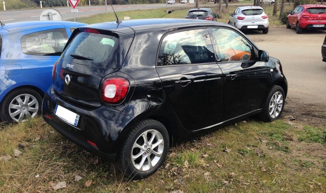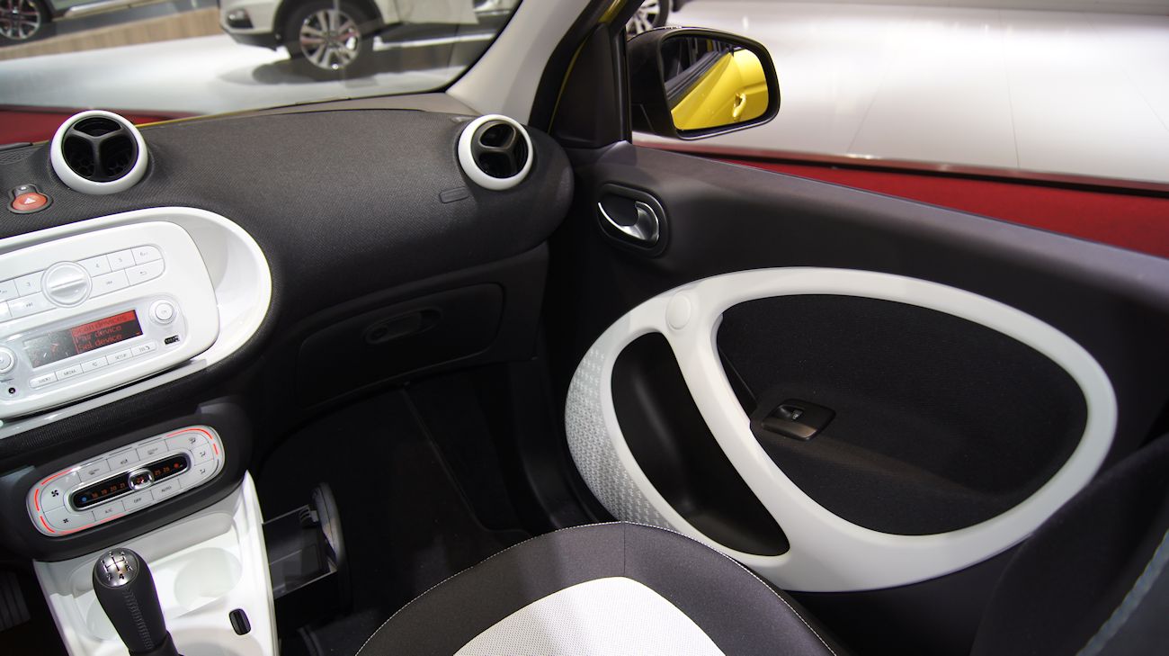 (Source Smart mars 2015) Affichage de l'état des ceintures arrière dans le plafonnier, Aide au démarrage en côte, Airbag genoux pour conducteur, Airbags conducteur et passager avant, Airbags latéraux pour conducteur et passager avant (airbags tête/thorax), Avertisseur d'oubli de ceinture pour le conducteur et le passager avant, Ceintures de sécurité trois points avec prétensionneurs et limiteurs d'effort (x4), Contrôle de pression des pneus, Drive lock - système automatique de fermeture des portes au démarrage, Fixations ISOFIX pour siège enfant à l'arrière, Kit de dépannage avec compresseur électrique, Régulateur de vitesse avec limiteur de vitesse, Régulation du comportement dynamique (ESP®), Sièges intégraux de sécurité, Système antiblocage des roues (abs) avec répartiteur électronique de freinage, Système de stabilisation en cas de vent latéral, Triangle de présignalisation, Zones de déformations à l'avant et à l'arrière, Boîte de vitesses mécanique à 5 rapports, Direction paramétrique à démultiplication variable et asservie à la vitesse, Fonction Stop/Start automatique (sauf sur motorisation 45 kW), Portes arrière s'ouvrant à 85°, Vitres arrière entrebâillantes à commande manuelle, Clignotants latéraux blancs, Pneus été, Projecteurs halogènes avec feux de jour à LED intégrés, Troisième feu stop, Cache-bagages, Console centrale avec double porte-gobelets à l’avant, porte-gobelet simple à l'arrière, Éclairage intérieur, OEillets d’arrimage dans le coffre, Réservoir de carburant 35 litres, Vide-poches dans les portes avant et arrière, Affichage de la température extérieure, avertisseur de verglas, Clignotants avec commande confort par impulsion, Essuie-glace arrière à cadencement et fonction de lavage/balayage automatique, Lunette arrière dégivrante, Lève-vitres électriques avant, Prise 12 volts avec cache, Verrouillage centralisé avec télécommande radio, témoin optique de fermeture et antidémarrage, Boîte à gants ouverte, Combiné d’instruments avec visuel LCD monochrome et ordinateur de bord : niveau de carburant, intervalles d'entretien, consommation instantanée, compteur kilométrique, affichage du rapport préconisé et horloge, Correcteur de portée des phares (commande manuelle), Dossier de banquette arrière monobloc rabattable, Garnitures des sièges en tissu noir, Pare-soleil avec support pour ticket de parking, Planche de bord et partie centrale des contre-portes finition noir et éléments de personnalisation dans le ton blanc/noir, Poignées de porte intérieures en finition noir, Pommeau du levier de vitesses finition noir, Préparation radio avec antenne et deux haut-parleurs, Siège passager avec fonction de chargement en longueur (dossier entièrement rabattable), Volant à 3 branches, Calandre finition noir black, Cellule de sécurité tridion dans le ton noir, Coques de rétroviseurs extérieurs finition noir*, Jantes 38,1 cm (15") avec pneus AV 165/65 R15 et AR 185/60 R15 et enjoliveurs, Panneaux de carrosserie dans le ton noir black ou blanc white, Poignées de porte finition noir, Rétroviseurs extérieurs à commande manuelle, Toit composite dans le coloris de la cellule de sécurité tridionPassion