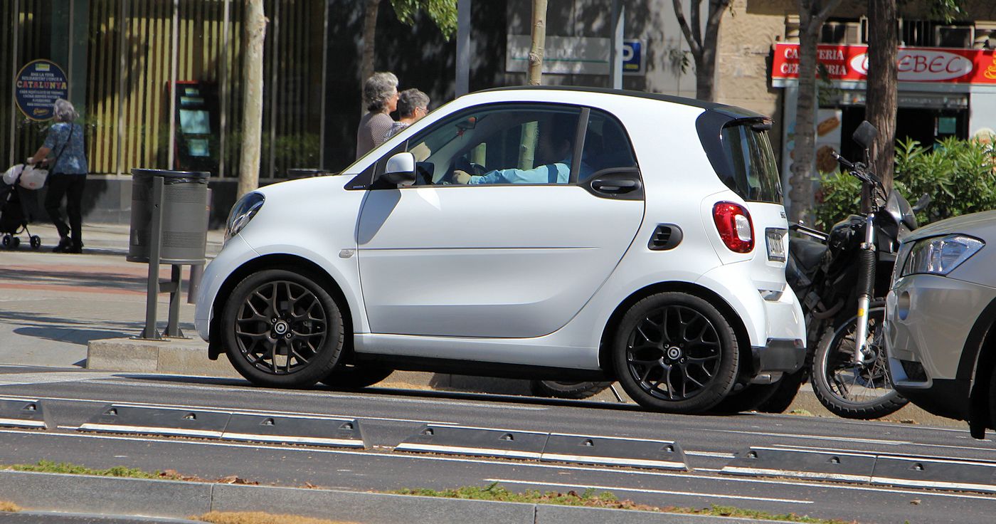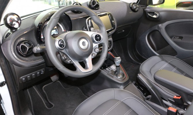 (Source Smart.com 2015) Panneaux de carrosserie (bodypanels) dans le ton noir black ou blanc white, Coques de rétroviseurs extérieurs finition grenue (noire), Calandre en finition grenue (noire), Jantes 38,1 cm (15") avec enjoliveurs et pneus de 165/65 R15 à l’avant et 185/60 R15 à l’arrière, Pneus été, Projecteurs halogènes H4 avec feux de jour à LED intégrés, Troisième feu stop, Clignotants latéraux (blancs), Poignées de portes finition grenue (noire), Toit composite noir, Intérieur., Planche de bord et parties centrales des contre-portes (noires) finition grenue et éléments de personnalisation dans le ton blanc, Garnitures en tissu (noir), Volant à 3 branches, barrette en noir brillant, Pommeau du levier de vitesses finition grenue (noire), Console centrale avec double porte-gobelets à l’avant, porte-gobelet simple à l’arrière, Poignées de portes intérieures en finition grenue (noire), Vide-poches dans les portes, Boîte à gants ouverte, Eclairage intérieur, Siège passager avec fonction de chargement en longueur (dossier entièrement rabattable), Pare-soleil avec support pour ticket de parking pour le conducteur et le passager, Œillets d’arrimage dans le coffre, Préparation radio, Cache-bagages, Eléments de commande électriques., Affichage de la température extérieure, avertisseur de verglas, Rétroviseurs extérieurs à commande manuelle, Lève-vitres électriques, Essuie-glaces confort à balayage intermittent avec fonction de lavage/balayage automatique, Essuie-glace arrière à cadencement et fonction de lavage/balayage automatique, Lunette arrière dégivrante, Combiné d’instruments avec visuel LCD monochrome et ordinateur de bord, Correcteur de portée des phares (commande manuelle), Clignotants avec commande confort par impulsion, Verrouillage centralisé avec télécommande radio, témoin optique de fermeture et antidémarrage, Prise 12 V avec cache dans la console centrale, Sécurité et systèmes d’aide à la conduite., Régulation du comportement dynamique (esp®), Système antiblocage des roues (abs) avec répartiteur électronique de freinage, Système de stabilisation en cas de vent latéral, Aide au démarrage en côte, Contrôle de la pression des pneus, Cellule de sécurité tridion, Régulateur de vitesse avec limiteur de vitesse (limitation de vitesse variable), Airbags pour le conducteur et le passager, Airbags latéraux pour le conducteur et le passager (airbag combiné tête et thorax), Airbag genoux pour le conducteur, Ceintures de sécurité trois points avec prétensionneurs et limiteurs d’effort, Avertisseur d’oubli de ceinture pour le conducteur et le passager, Fixation ISOFIX pour siège enfant sur le siège passager avec désactivation manuelle de l’airbag, Capteur de collision pour l’activation des feux de détresse, Fermeture automatique des ouvrants au démarrage (drive lock), Rétroviseur extérieur avec miroir asphérique bombé côté conducteur, Direction paramétrique asservie à la vitesse, Technologie., Boîte de vitesses mécanique à 5 rapports, Fonction Stop/Start automatique, Réservoir de carburant de 35 litres