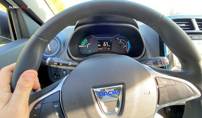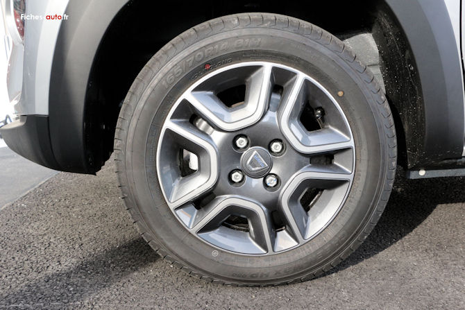 Comme déjà dit on a affaire à quelque chose qui n'est pas des plus rigoureux, et ce en raison de deux faiblesses : un centre de gravité perché assez haut et surtout des pneumatiques d'une taille qui rappellent les citadines des années 90. Pour revenir à la garde au sol, notons qu'elle paraît finalement plus haute que ce qu'elle n'est en vrai. En effet, on reste ici sur 15 cm quand la Sandero 3 classique (pas la Stepway réhaussée) dépasse de peu les 16 cm. En réalité c'est la petitesse des pneus qui induit ce sentiment et qui laisse même croire qu'on est haut perché (au niveau visuel mais aussi des sensations). De petits pneus induisent plus de roulis et moins de connexion à la route, et c'est ici que la Spring pêche un peu ... La marque voulait toutefois proposer une autonomie un minimum correcte avec seulement 27.4 kWh utiles, il fallait donc avoir des pneus les plus fins possible.