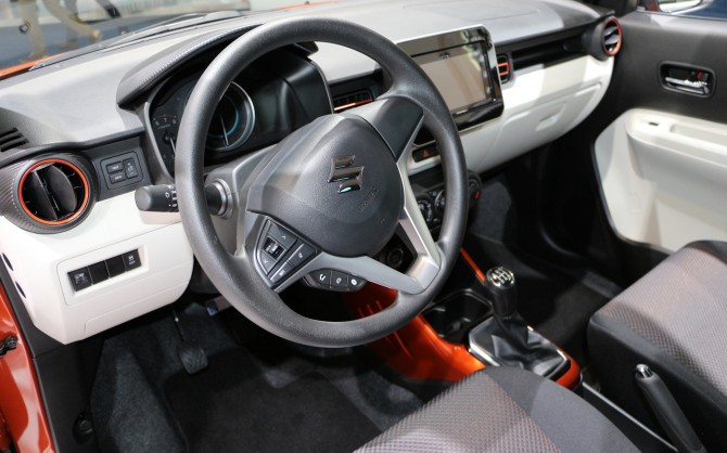 (Source Suzuki février 2018) A partir de 12 990 euros : Bouclier avant et arrière ton carrosserie // Jantes en acier 15’’ avec enjoliveurs et pneumatiques 175/65 // Montants A & B noirs // Ouverture du hayon : manuelle avec poignée // Poignées de porte ton carrosserie // Allumage automatique des projecteurs // Dispositif de réglage des projecteurs (manuellement) // Essuies-glaces : avant 2 vitesses et intermittence + arrière 1 vitesse avec intermittence // Feux de jour halogènes (montés dans le bouclier avant) // Fonction “Guide me home”(1) // Lunette arrière chauffante // Projecteurs halogène multi-réflecteur // Rétroviseur intérieur réglable manuellement // Rétroviseurs extérieurs ton carrosserie et réglables électriquement // Vitres arrière teintées // Affichage du non bouclage des ceintures de sécurité aux places arrière // Affichage et alame sonore du non bouclage des ceintures de sécurité aux places avant // Ordinateur de bord // Alarme sonore d’oubli d’extinction des feux et/ou retrait de la clé de contact // Alerte niveau carburant bas // Alerte porte mal fermée // Alerte vidange huile moteur // Compte-tours // Direction assistée // Volant 3 branches réglable en hauteur avec contrôle audio, téléphonie mains-libre et accès direct Bluetooth®(2) // Air conditionné // Fermeture centralisée côté conducteur et télécommande // Filtre à pollen // Lève-vitres électriques avant // Système audio : Haut parleur à l’avant et à l’arrière et Lecteur CD compatible MP3 // Banquette arrière rabattable 60/40 avec appuis-tête x 3 // Cache-bagage // Cerclage d’ouie d’aérateur couleur argent // Couleur d’habillage de l’habitacle noir et blanc // Entourage de la console centrale : orange ou gris titane // Kit de réparation de pneumatiques // Lecteur de carte avant (3 positions) // Ornements des portes avant et arrière noir et blanc // Ouverture à distance de la trappe à essence // Pare-soleil côté conducteur avec porte ticket et miroir de courtoisie // Poignée de maintien dans les portes avant : orange ou gris titane // Poignées de maintien côté passager avant // Poignées de portes intérieures chromées // Porte bouteille (avant x 2 et arrière x 2) // Porte gobelet (avant x 2 et arrière x 1) // Prise USB et prise accessoire 12V // Rangement dans la console centrale // Repose pied côté conducteur // Sellerie tissu avec motifs orange ou gris titane // ABS avec EBD (répartiteur électronique de freinage) // Airbags frontaux conducteur et passager avant // Airbags latéraux conducteur et passager avant // Airbags rideaux // Ancrages d’attache pour sièges enfants x 2 // Assistance au freinage d’urgence // ESP®(3) // Fixations ISOFIX aux places arrière pour sièges enfants x 2 // Pédalier rétractable en cas de collision (frein et embrayage) // Renforts latéraux dans les portes // Sécurité enfants sur les portes arrière // Système de désactivation de l’airbag passager avant // TPMS (Témoin de perte de pression des pneumatiques) // Troisième feu stop à LED