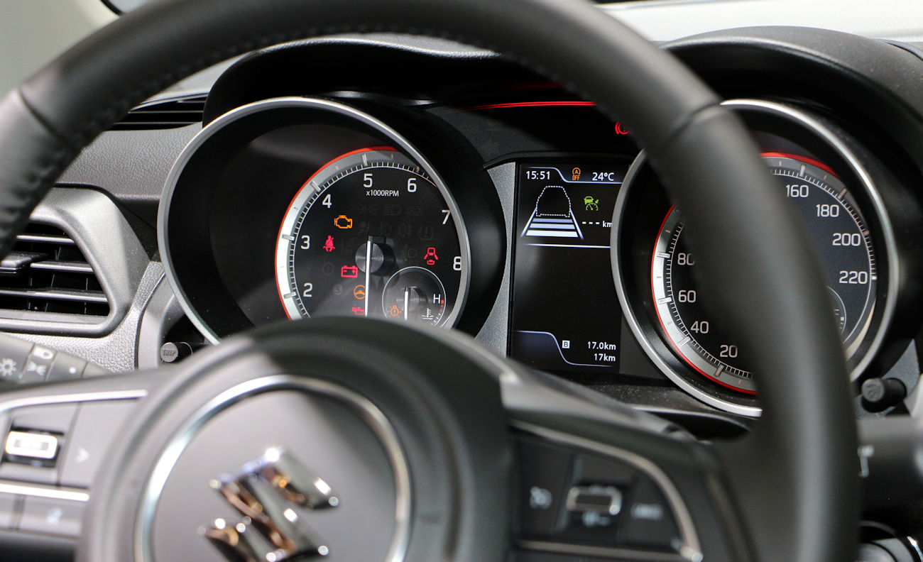 A partir de 16 840 euros : Aide au démarrage en côte // Air conditionné à régulation automatique // Alerte de changement de trajectoire // Alerte de franchissement de ligne // Appuis-tête arrière X 3 // Contrôle du régulateur et du limiteur de vitesse sur le volant // Décor de la planche de bord " Pearl White" // Dispositif automatique de réglage en hauteur des projecteurs // Dispositif d'ouverture des portes et de démarrage sans clé // Engine Auto Stop Start System (EASS) // Feux de jour à LED (intégrés dans les projecteurs) // Freinage actif d'urgence DSBS (Dual Sensor Brake Support) // Gestion automatique des feux de croisement / feux de route // Hybrid SHVS (Smart Hybrid Vehicle by Suzuki) // Jantes en alliage léger polies et pneumatiques 185/55 // Lève-vitres électriques arrière // Limiteur de vitesse // Navigation cartographie Europe, monuments 3D // Ordinateur de bord avec écran couleur LCD 4.2'' // Ornement des portes avant "Pearl White" // Poignées de maintien côté passager arrière X 2 // Projecteurs et feux arrière à LED // Régulateur de vitesse adaptatif ACC (Adaptive Cruise Control) // Rétroviseurs extérieurs rabattables électriquement avec répétiteur de clignotant // Tweeters avant // Volant réglable en profondeur