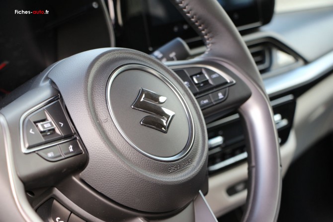 A partir de 19 490 euros : Jantes alliage 16 pouces au design spécifique // Pneus 185/55 R16 // Capteurs de stationnement avant et arrière // Avertisseur d'angle mort // Alerte trafic arrière // Régulateur de vitesse adaptatif // Feux LED plus performants // Combiné d'instrumentation numérique élargi // Sellerie améliorée // Accès sans clé étendu // Caméra de recul // Sièges chauffants // Climatisation automatique // Multimédia 9 pouces // Apple CarPlay et Android Auto sans fil // 4 haut-parleurs // Suzuki Connect // Rétroviseurs rabattables électriquement // Système mild hybrid 12V // Pack complet d'aides à la conduite incluant maintien dans la voie, aide au freinage d'urgence, reconnaissance des panneaux et détection piétons.