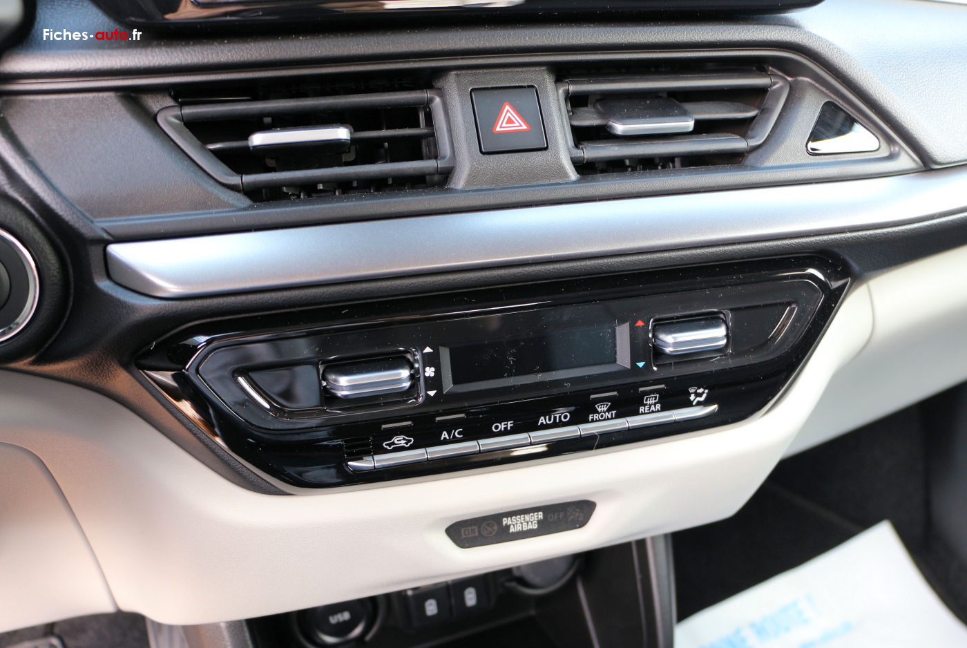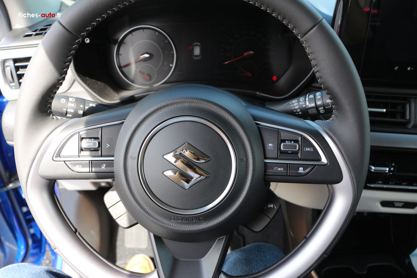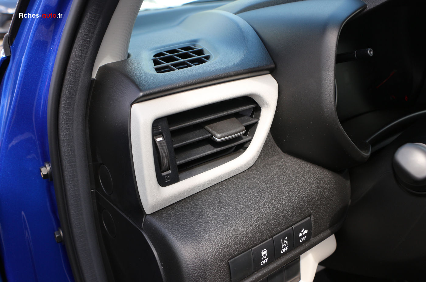La présentation intérieure reste très conservatrice. On sent que Suzuki n'a pas cherché à faire moderne à tout prix. Le dessin du tableau de bord est typique des voitures des années 2000 et 2010, l'ensemble est austère avec une impression générale de sérieux plus que de fantaisie (bien que les couleurs beige amènent de la fraicheur et égayent le tout). Il y a aussi quelques tentatives de raffinement avec des éléments texturés ou qui imitent le métal, ne soyons pas trop mauvaise langue même si de manière générale on n'est pas sur quelque chose de très travaillé ni novateur (ce qui compense parfois une qualité moyenne). Les compteurs restent très lisibles, avec deux cadrans ronds encadrant un petit affichage numérique central pour les infos de bord. C'est clair, efficace, mais ça ne raconte pas grand-chose visuellement.
