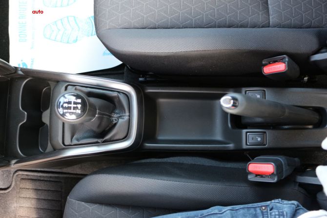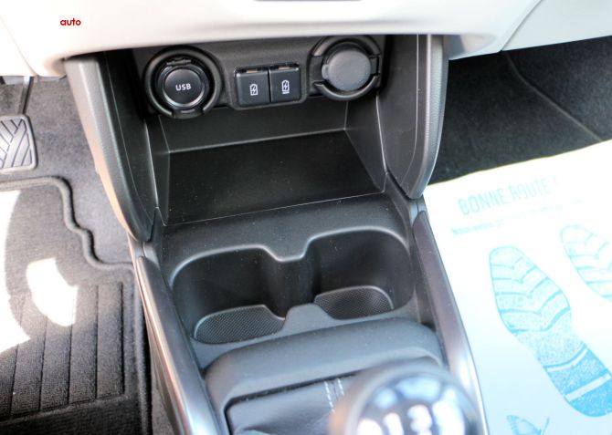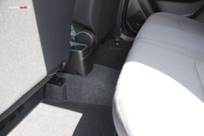 Côté rangements, on reste sur quelque chose de fonctionnel mais sans excès. Les bacs de porte à l'avant peuvent accueillir une bouteille, mais ils ne sont ni très profonds ni très larges. La console centrale regroupe deux porte-gobelets (il y en a aussi un pour les passagers arrière), un petit vide-poches devant le levier de vitesse et parfois un rangement sous accoudoir selon version. À l'arrière, il n'y a pas d'accoudoir central ni de rangement dédié entre les sièges, uniquement de petits bacs de porte et des dossiers de sièges simples. Globalement, on trouve de quoi poser les objets du quotidien, mais ceux qui aiment multiplier les compartiments fermés et les rangemetns malins resteront un peu sur leur faim.