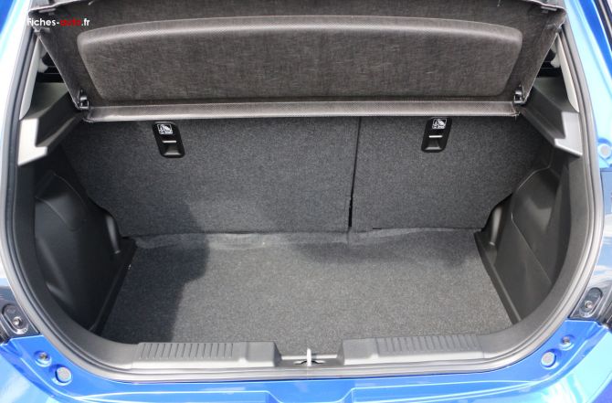 Le coffre affiche 265 litres en configuration 5 places. C'est dans le bas de la moyenne pour la catégorie, mais utilisable au quotidien pour des courses ou un petit week-end. Une fois la banquette rabattue, on grimpe à environ 980 litres en chargeant jusqu'au pavillon. Le volume devient alors suffisant pour des objets plus volumineux, mais le seuil de chargement haut et la forme globalement cubique rappellent qu'on est sur une petite auto. On ne parle pas d'un break compact, et ça se ressent dès qu'on veut cumuler poussette + bagages.