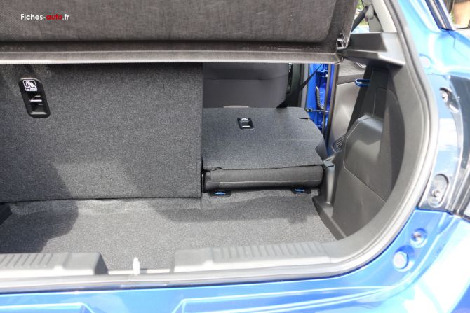 La banquette arrière se rabat en deux parties 60/40, ce qui permet au moins de jongler un peu entre passagers et chargement. En revanche, la Swift ne propose pas de plancher modulable ou de double fond sophistiqué. Une fois les dossiers basculés, on se retrouve avec une marche nette entre le plancher du coffre et l'arrière des sièges. Pour glisser un meuble plat, une planche ou simplement un gros carton, ce décroché est vite agaçant. C'est courant dans le segment des citadines polyvalentes, mais certains concurrents commencent à corriger le tir, ce qui met un peu en lumière ce manque ici.