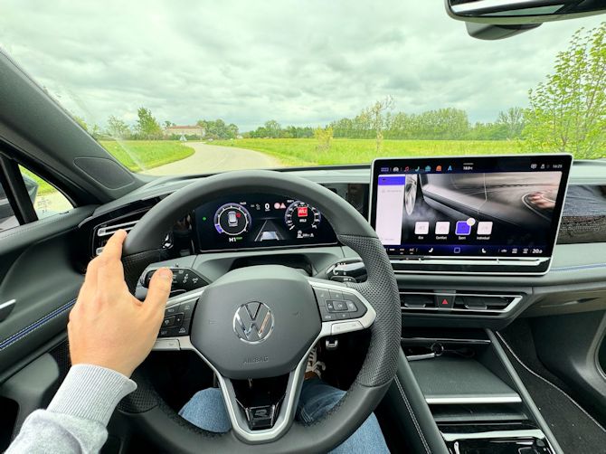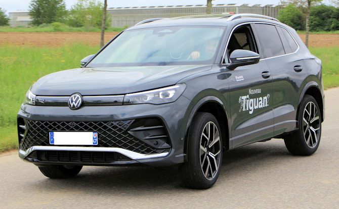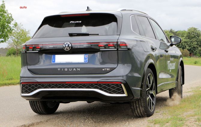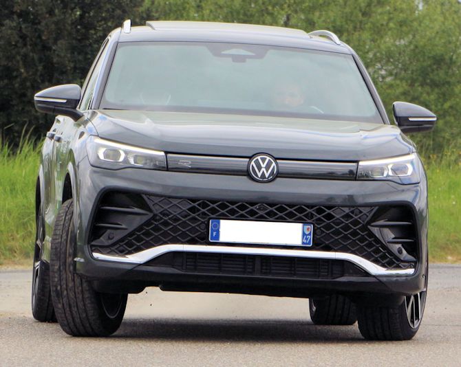 Chose étonnante, et je vais bien appuyer dessus, c'est qu'en cette période qui priorise la sobriété Volkswagen a quand même réussi à proposer des pneus de 255 mm de large ! Sur les thermiques conventionnels en 2024 c'est quelque chose que je n'espérais même pas voir (il y avait bien du 255 mm de large sur l'ancien Tiguan mais ça se réservait au R de 320 ch avec les 20 pouces seulement). Résultat, une tenue de route de premier ordre malgré des trains roulants assez conventionnels en termes de réglage de géométrie (ce qui favorise toutefois la durabilité des gommes). Bref, il faut donc bien assimiler que le Tiguan propose ici du gros calibre pour les masses non suspendues (sur les R-Line), et que c'est ici la clé d'une bonne rigueur sur route. Se serait-il pour un petit Touareg la Tiguan ?...