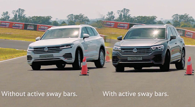 Au delà d'améliorer les capacités en courbe, ce dispositif permet surtout de profiter à la fois d'un confort exceptionnel tout en profitant d'une efficacité majorée. En effet, tout le problème est qu'en virage il faut idéalement des barres bien tendues (pour limiter roulis et tangage) mais en ligne droite il faut les détendre si on veut éviter de ressentir trop les imperfections de la route. Ici on a donc un pilotage électronique de leur tension par le biais d'un calculateur qui fera en sorte que vous ayez le maximum de confort et d'efficacité. Certes pas indispensable, ça permet toutefois de définitivement rendre le Touareg intéressant à conduire.