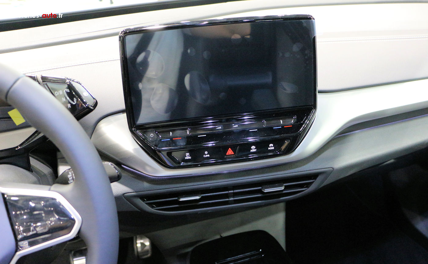 Tout tactile, l'ergonomie n'est pas super intuitive et le système est un peu long a démarrer ( beaucoup mieux depuis la mise à jour mais quand même)- Assistance vocale aléatoire selon réception du réseau mobile.- Navigation intégrée correcte mais pas exceptionnelle, heureusement qu'il y a Google/Apple- Des commandes sous l'écran ne sont pas éclairées de nuit- "Piliers" de pare-brise trop larges gêne parfois la visibilité dans les ronds points- WeConnect fiable mais très limité en fonctionnalités.-Crochet d'attelage uniquement pour vélo , impossible de tracter et pas de barre de toit possible.-1ere monte de pneu ( Bridgestone) parti au bout de 25000 à l’arrière et 30000km à l'avant en ayant le pied vraiment léger , les Continentales conseillés par VW semble plus durable. -L'absence de pompe à chaleur impacte beaucoup la consommation en hiver-Révision faite par VW tout les 2 ans chère au vu des élèments changés filtre habitacle , essuies glace, "test batterie" et "passage au banc" (180¤ + 70¤ de changement de liquide de frein)-Sous coffre tout juste pour le chargeur domicile , une paire de gant , un gonfleur et des sangles, pas de fruck. (Pure 45 kWh Electrique 150 ch 110 kW 150 ch Pure Performance 45kwh 45 000km )