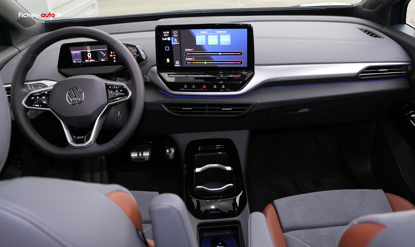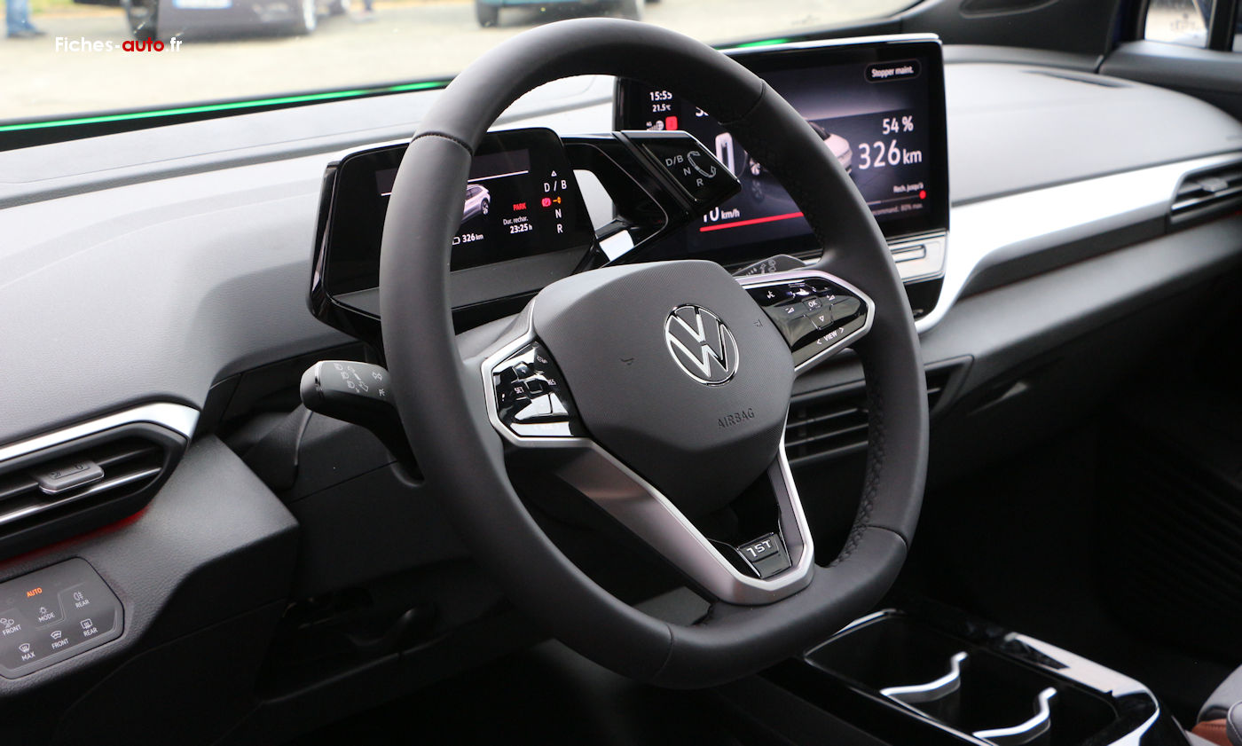 (Source VW septembre 2021) A partir de 40 600 euros : Tableau de bord personnalisable (3 coloris) // Revêtement du tableau de bord et des portes soft-touch // Sellerie en tissu, en ArtVelours et similicuir, bicolore et dossier perfore "ID." // Sièges avant chauffants réglables en hauteur // Tapis de sol avant et arrière // Pédalier en acier inoxydable avec symboles 'Play & Pause' // Volant capacitif multifonction et chauffant // Accoudoirs pour les sièges avant // Console centrale avec rangements modulable et 2 porte-gobelets // 2 port USB-C a l’avant (recharge et data) et 2 à l’arrière (recharge) // Éclairage d’ambiance personnalisable (30 couleurs) // Rétroviseur intérieur à réglage jour/nuit automatique // Rétroviseurs extérieurs réglables et rabattables (électriquement) et dégivrants // Climatiseur 2-Zones "Air Care Climatronic" avec filtre a charbon actif // Pare-brise en verre athermique, chauffant avec isolation phonique renforcée // Banquette arrière 2/3 1/3 avec accoudoir central et trappe a skis (3 personnes) // Système de navigation & Infotainment ‘Discover Pro‘ avec “Services de streaming et radio via Internet” // Interface téléphonique Bluetooth® Confort avec fonction de recharge par induction (en fonction du téléphone compatible) // Jantes en alliage 18" 'Falun' bicolore argent/noir