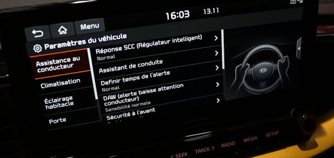 Nous avons ici de série l'aide au maintien dans la voie, à savoir dès la finition Active. Il faut ensuite grimper au plus haut niveau de finition pour profiter de la reconnaissance des panneaux, de la surveillance des angles morts et du système de détection de trafic en sortie de place (en marche arrière).