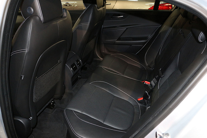 L'espace sur la banquette arrière est à la fois pénalisé par une largeur qui empêche d'être bien à trois, mais aussi par l'espace aux jambes qui vient à manquer pour les grands gabarits. Ne soyez donc pas trop grand si vous envisagez l'achat de cet "Jag". Cela tombe bien, les Français ne sont généralement pas des géants !